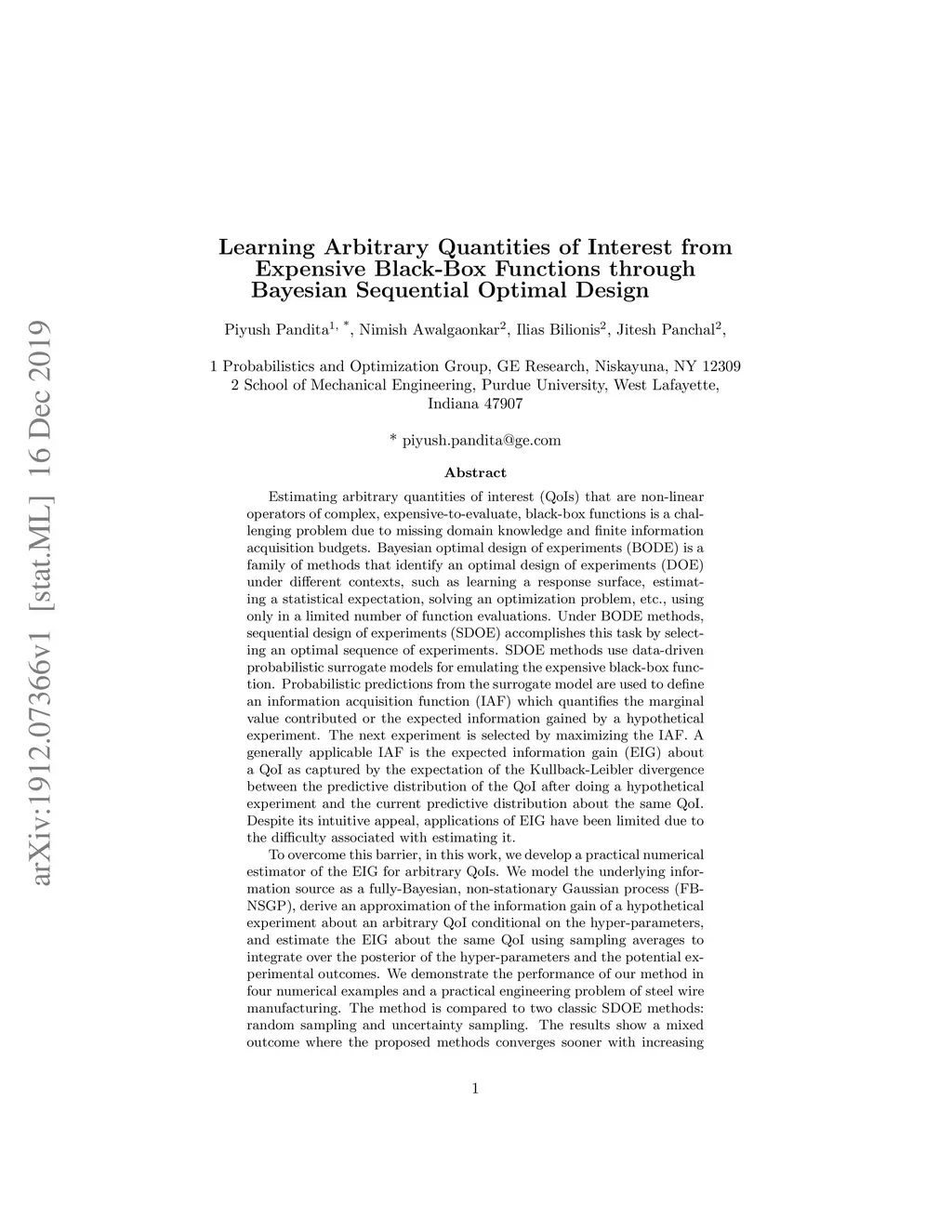 Estimating arbitrary quantities of interest (QoIs) that are non-linear operators of complex, expensive-to-evaluate, black-box functions is a challenging problem due to missing domain knowledge and finite budgets. Bayesian optimal design of experiments (BODE) is a family of methods that identify an optimal design of experiments (DOE) under different contexts, using only in a limited number of function evaluations. Under BODE methods, sequential design of experiments (SDOE) accomplishes this task by selecting an optimal sequence of experiments while using data-driven probabilistic surrogate models instead of the expensive black-box function. Probabilistic predictions from the surrogate model are used to define an information acquisition function (IAF) which quantifies the marginal value contributed or the expected information gained by a hypothetical experiment. The next experiment is selected by maximizing the IAF. A generally applicable IAF is the expected information gain (EIG) about a QoI as captured by the expectation of the Kullback-Leibler divergence between the predictive distribution of the QoI after doing a hypothetical experiment and the current predictive distribution about the same QoI. We model the underlying information source as a fully-Bayesian, non-stationary Gaussian process (FBNSGP), and derive an approximation of the information gain of a hypothetical experiment about an arbitrary QoI conditional on the hyper-parameters The EIG about the same QoI is estimated by sample averages to integrate over the posterior of the hyper-parameters and the potential experimental outcomes. We demonstrate the performance of our method in four numerical examples and a practical engineering problem of steel wire manufacturing. The method is compared to two classic SDOE methods: random sampling and uncertainty sampling.