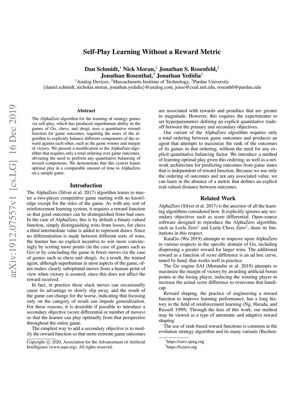 Self-Play Learning Without a Reward Metric