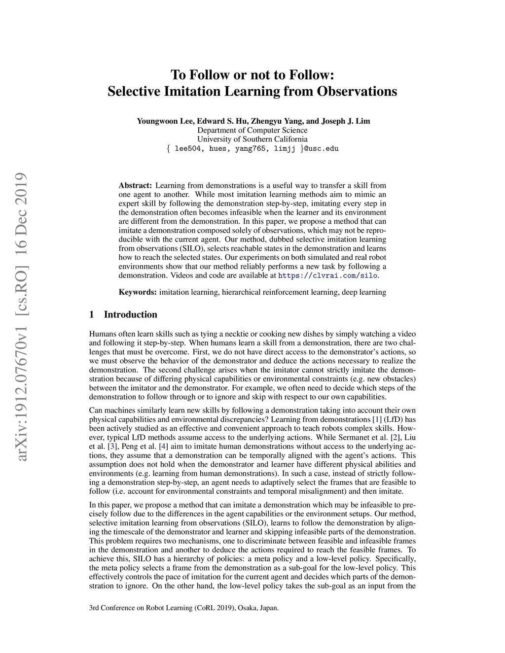 Learning from demonstrations is a useful way to transfer a skill from one agent to another. While most imitation learning methods aim to mimic an expert skill by following the demonstration step-by-step, imitating every step in the demonstration often becomes infeasible when the learner and its environment are different from the demonstration. In this paper, we propose a method that can imitate a demonstration composed solely of observations, which may not be reproducible with the current agent. Our method, dubbed selective imitation learning from observations (SILO), selects reachable states in the demonstration and learns how to reach the selected states. Our experiments on both simulated and real robot environments show that our method reliably performs a new task by following a demonstration. Videos and code are available at https://clvrai.com/silo .