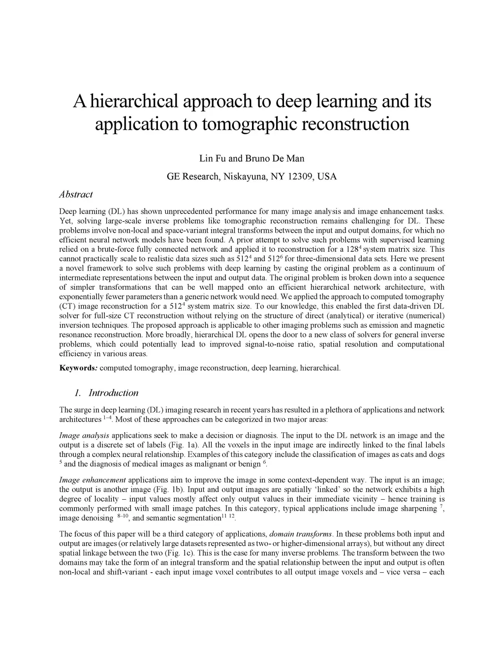 Deep learning (DL) has shown unprecedented performance for many image analysis and image enhancement tasks. Yet, solving large-scale inverse problems like tomographic reconstruction remains challenging for DL. These problems involve non-local and space-variant integral transforms between the input and output domains, for which no efficient neural network models have been found. A prior attempt to solve such problems with supervised learning relied on a brute-force fully connected network and applied it to reconstruction for a system matrix size. This cannot practically scale to realistic data sizes such as and for three-dimensional data sets. Here we present a novel framework to solve such problems with deep learning by casting the original problem as a continuum of intermediate representations between the input and output data. The original problem is broken down into a sequence of simpler transformations that can be well mapped onto an efficient hierarchical network architecture, with exponentially fewer parameters than a generic network would need. We applied the approach to computed tomography (CT) image reconstruction for a system matrix size. To our knowledge, this enabled the first data-driven DL solver for full-size CT reconstruction without relying on the structure of direct (analytical) or iterative (numerical) inversion techniques. The proposed approach is applicable to other imaging problems such as emission and magnetic resonance reconstruction. More broadly, hierarchical DL opens the door to a new class of solvers for general inverse problems, which could potentially lead to improved signal-to-noise ratio, spatial resolution and computational efficiency in various areas.