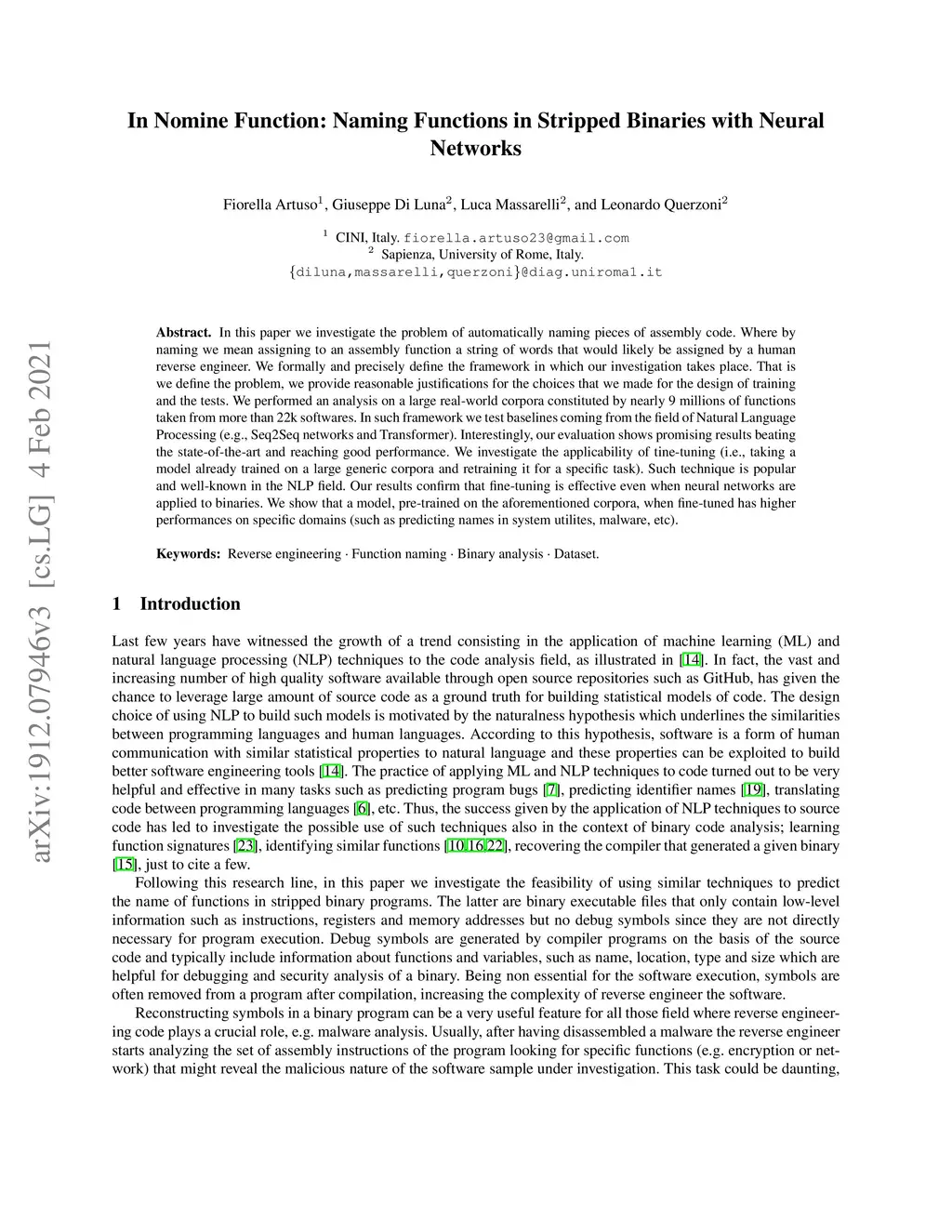 In Nomine Function: Naming Functions in Stripped Binaries with Neural