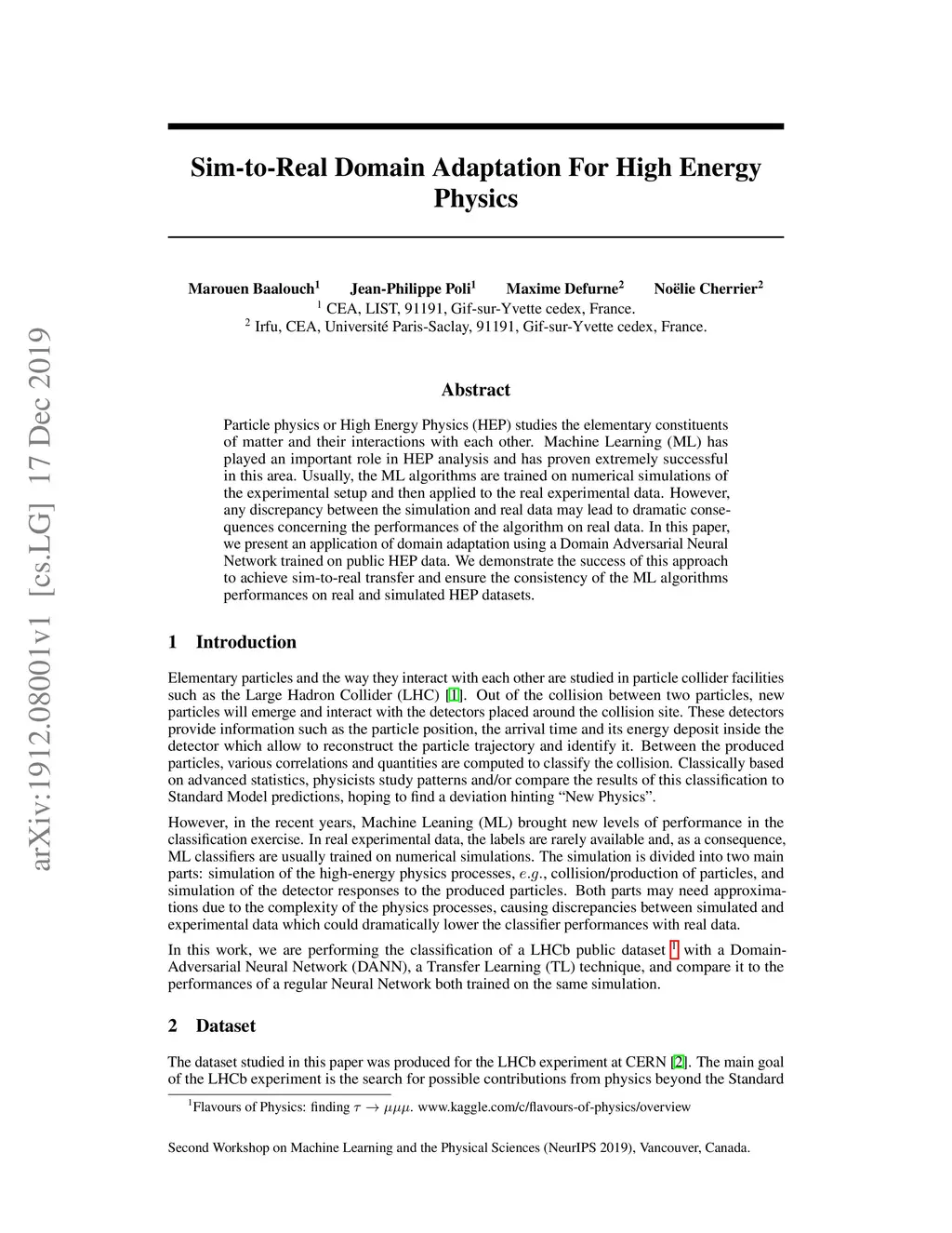 Particle physics or High Energy Physics (HEP) studies the elementary constituents of matter and their interactions with each other. Machine Learning (ML) has played an important role in HEP analysis and has proven extremely successful in this area. Usually, the ML algorithms are trained on numerical simulations of the experimental setup and then applied to the real experimental data. However, any discrepancy between the simulation and real data may lead to dramatic consequences concerning the performances of the algorithm on real data. In this paper, we present an application of domain adaptation using a Domain Adversarial Neural Network trained on public HEP data. We demonstrate the success of this approach to achieve sim-to-real transfer and ensure the consistency of the ML algorithms performances on real and simulated HEP datasets.