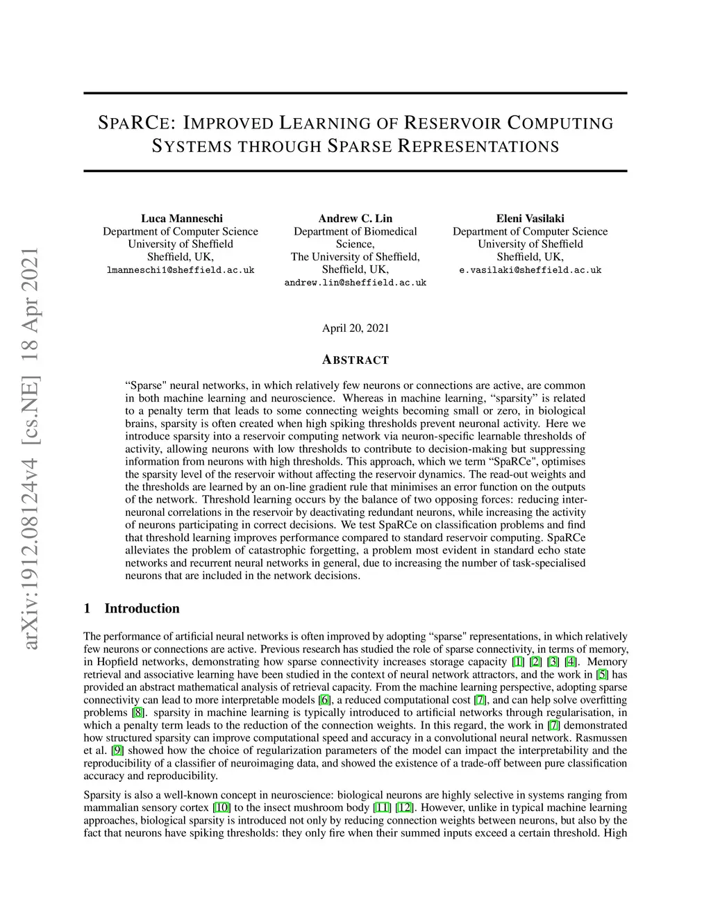 SpaRCe: Improved Learning of Reservoir Computing Systems through Sparse