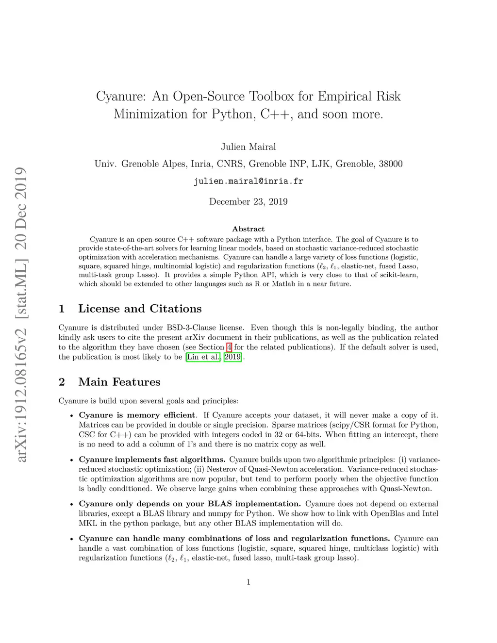 Cyanure is an open-source C++ software package with a Python interface. The goal of Cyanure is to provide state-of-the-art solvers for learning linear models, based on stochastic variance-reduced stochastic optimization with acceleration mechanisms. Cyanure can handle a large variety of loss functions (logistic, square, squared hinge, multinomial logistic) and regularization functions (l_2, l_1, elastic-net, fused Lasso, multi-task group Lasso). It provides a simple Python API, which is very close to that of scikit-learn, which should be extended to other languages such as R or Matlab in a near future.