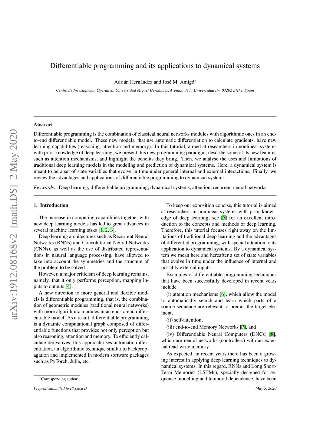 Differentiable programming is the combination of classical neural networks modules with algorithmic ones in an end-to-end differentiable model. These new models, that use automatic differentiation to calculate gradients, have new learning capabilities (reasoning, attention and memory). In this tutorial, aimed at researchers in nonlinear systems with prior knowledge of deep learning, we present this new programming paradigm, describe some of its new features such as attention mechanisms, and highlight the benefits they bring. Then, we analyse the uses and limitations of traditional deep learning models in the modeling and prediction of dynamical systems. Here, a dynamical system is meant to be a set of state variables that evolve in time under general internal and external interactions. Finally, we review the advantages and applications of differentiable programming to dynamical systems.