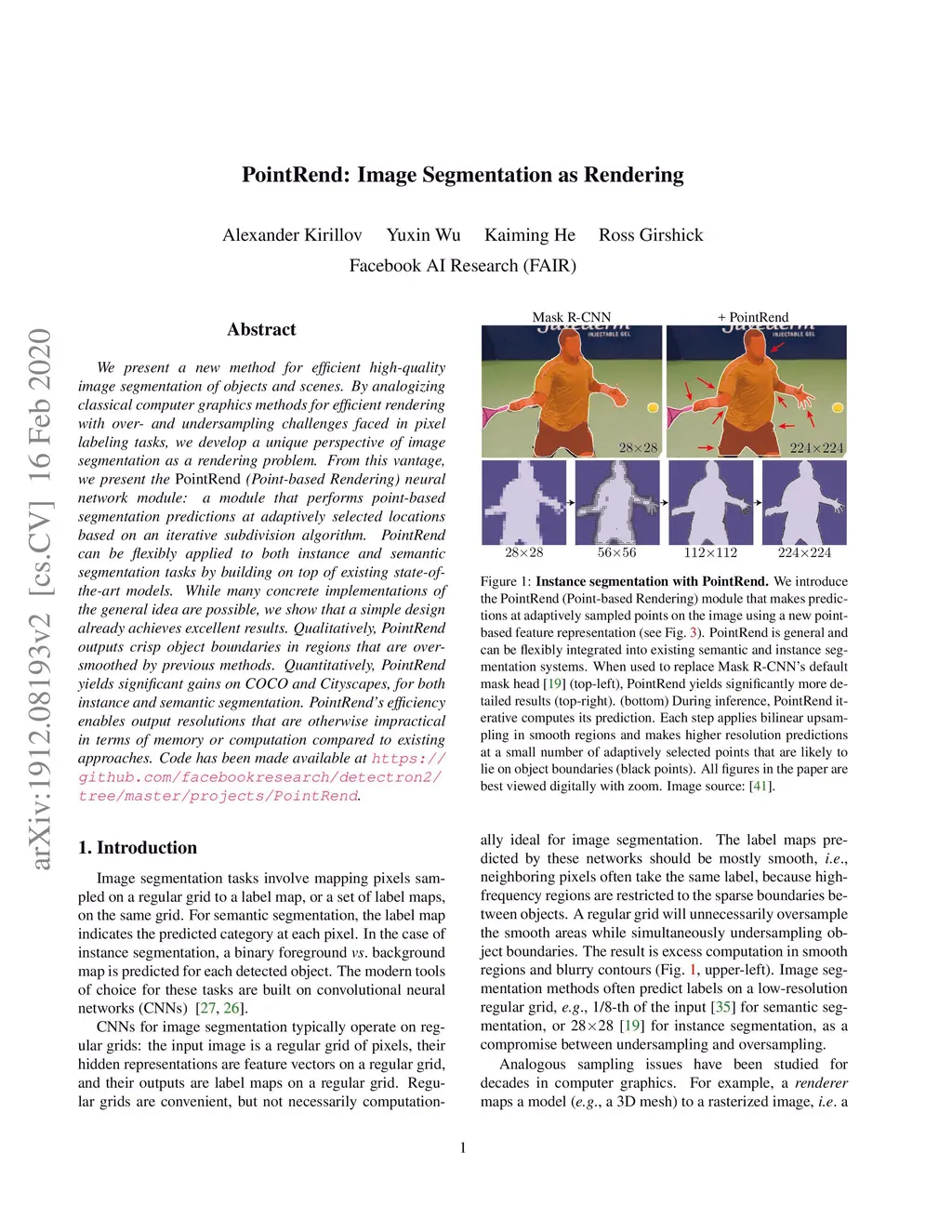 We present a new method for efficient high-quality image segmentation of objects and scenes. By analogizing classical computer graphics methods for efficient rendering with over- and undersampling challenges faced in pixel labeling tasks, we develop a unique perspective of image segmentation as a rendering problem. From this vantage, we present the PointRend (Point-based Rendering) neural network module: a module that performs point-based segmentation predictions at adaptively selected locations based on an iterative subdivision algorithm. PointRend can be flexibly applied to both instance and semantic segmentation tasks by building on top of existing state-of-the-art models. While many concrete implementations of the general idea are possible, we show that a simple design already achieves excellent results. Qualitatively, PointRend outputs crisp object boundaries in regions that are over-smoothed by previous methods. Quantitatively, PointRend yields significant gains on COCO and Cityscapes, for both instance and semantic segmentation. PointRend's efficiency enables output resolutions that are otherwise impractical in terms of memory or computation compared to existing approaches. Code has been made available at https://github.com/facebookresearch/detectron2/tree/master/projects/PointRend.