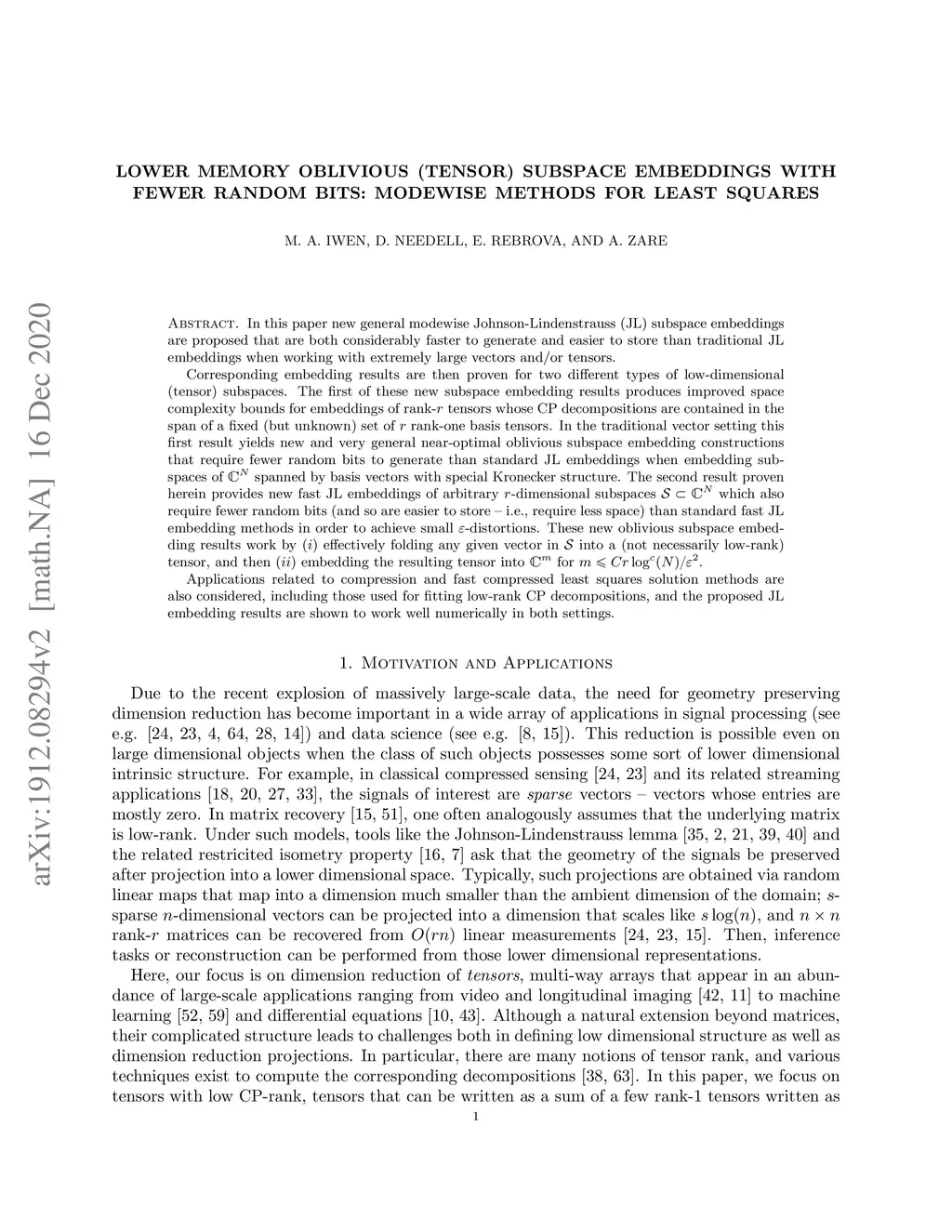In this paper new general modewise Johnson-Lindenstrauss (JL) subspace embeddings are proposed that are both considerably faster to generate and easier to store than traditional JL embeddings when working with extremely large vectors and/or tensors. Corresponding embedding results are then proven for two different types of low-dimensional (tensor) subspaces. The first of these new subspace embedding results produces improved space complexity bounds for embeddings of rank- tensors whose CP decompositions are contained in the span of a fixed (but unknown) set of rank-one basis tensors. In the traditional vector setting this first result yields new and very general near-optimal oblivious subspace embedding constructions that require fewer random bits to generate than standard JL embeddings when embedding subspaces of spanned by basis vectors with special Kronecker structure. The second result proven herein provides new fast JL embeddings of arbitrary -dimensional subspaces which also require fewer random bits (and so are easier to store - i.e., require less space) than standard fast JL embedding methods in order to achieve small -distortions. These new oblivious subspace embedding results work by effectively folding any given vector in into a (not necessarily low-rank) tensor, and then embedding the resulting tensor into for . Applications related to compression and fast compressed least squares solution methods are also considered, including those used for fitting low-rank CP decompositions, and the proposed JL embedding results are shown to work well numerically in both settings.