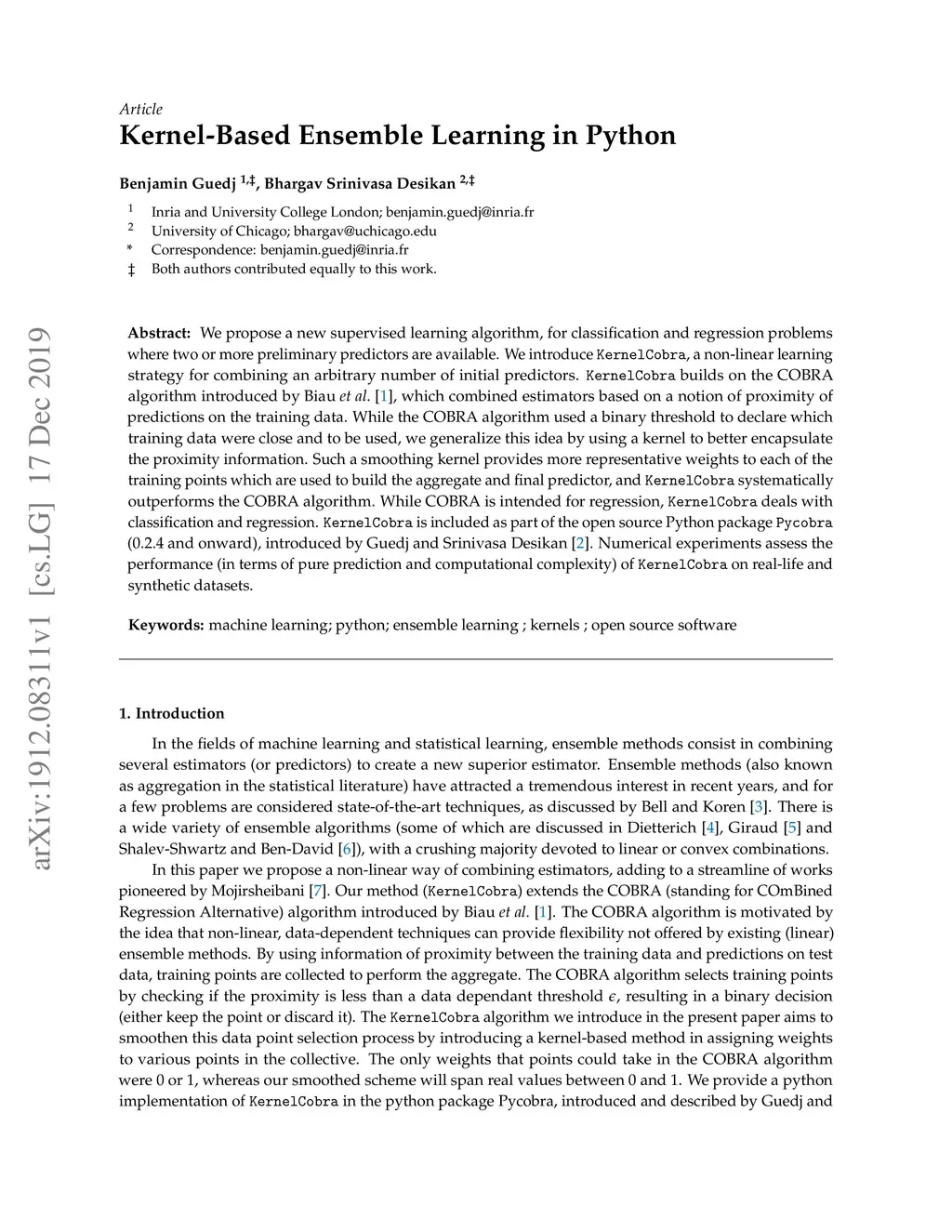 We propose a new supervised learning algorithm, for classification and regression problems where two or more preliminary predictors are available. We introduce \texttt{KernelCobra}, a non-linear learning strategy for combining an arbitrary number of initial predictors. \texttt{KernelCobra} builds on the COBRA algorithm introduced by \citet{biau2016cobra}, which combined estimators based on a notion of proximity of predictions on the training data. While the COBRA algorithm used a binary threshold to declare which training data were close and to be used, we generalize this idea by using a kernel to better encapsulate the proximity information. Such a smoothing kernel provides more representative weights to each of the training points which are used to build the aggregate and final predictor, and \texttt{KernelCobra} systematically outperforms the COBRA algorithm. While COBRA is intended for regression, \texttt{KernelCobra} deals with classification and regression. \texttt{KernelCobra} is included as part of the open source Python package \texttt{Pycobra} (0.2.4 and onward), introduced by \citet{guedj2018pycobra}. Numerical experiments assess the performance (in terms of pure prediction and computational complexity) of \texttt{KernelCobra} on real-life and synthetic datasets.