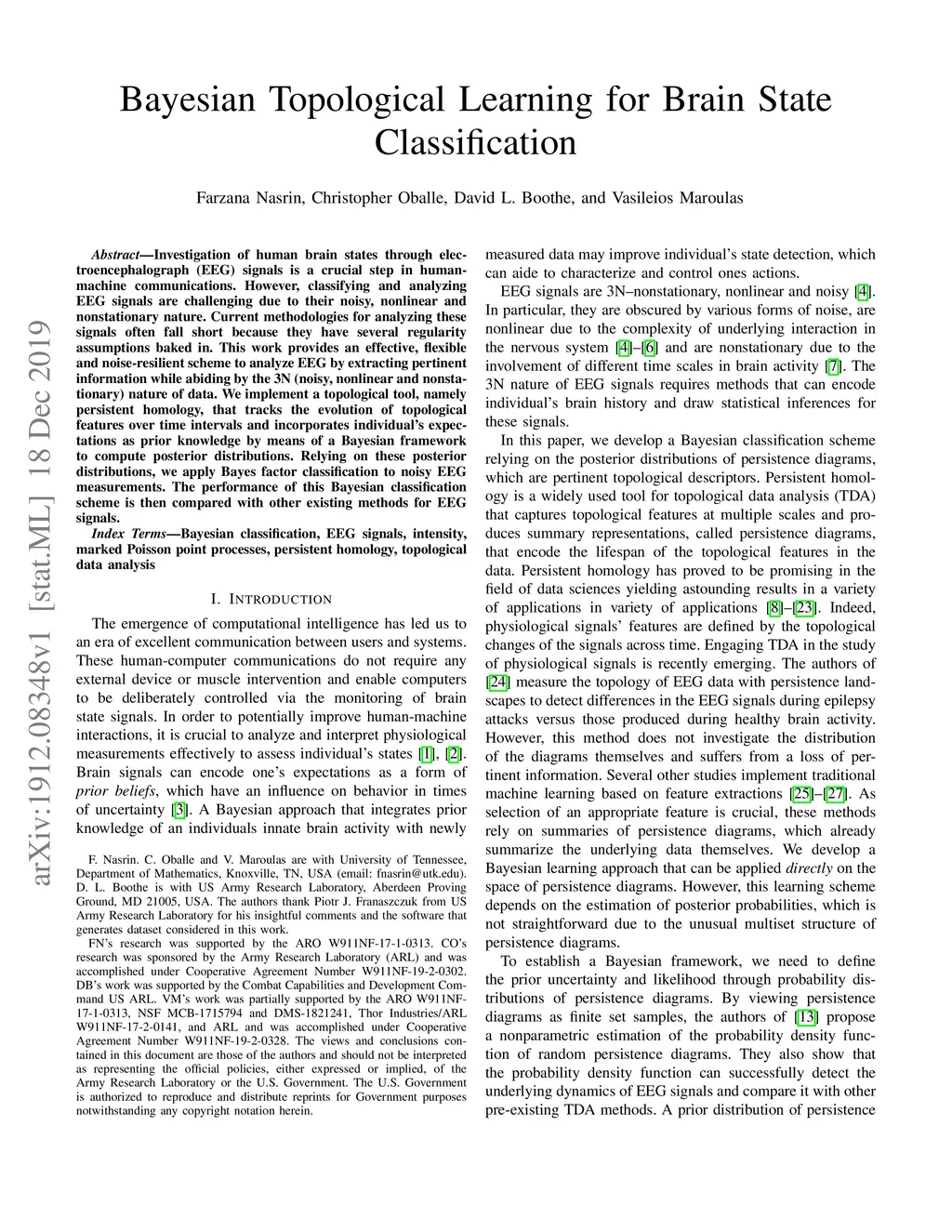 Investigation of human brain states through electroencephalograph (EEG) signals is a crucial step in human-machine communications. However, classifying and analyzing EEG signals are challenging due to their noisy, nonlinear and nonstationary nature. Current methodologies for analyzing these signals often fall short because they have several regularity assumptions baked in. This work provides an effective, flexible and noise-resilient scheme to analyze EEG by extracting pertinent information while abiding by the 3N (noisy, nonlinear and nonstationary) nature of data. We implement a topological tool, namely persistent homology, that tracks the evolution of topological features over time intervals and incorporates individual's expectations as prior knowledge by means of a Bayesian framework to compute posterior distributions. Relying on these posterior distributions, we apply Bayes factor classification to noisy EEG measurements. The performance of this Bayesian classification scheme is then compared with other existing methods for EEG signals.