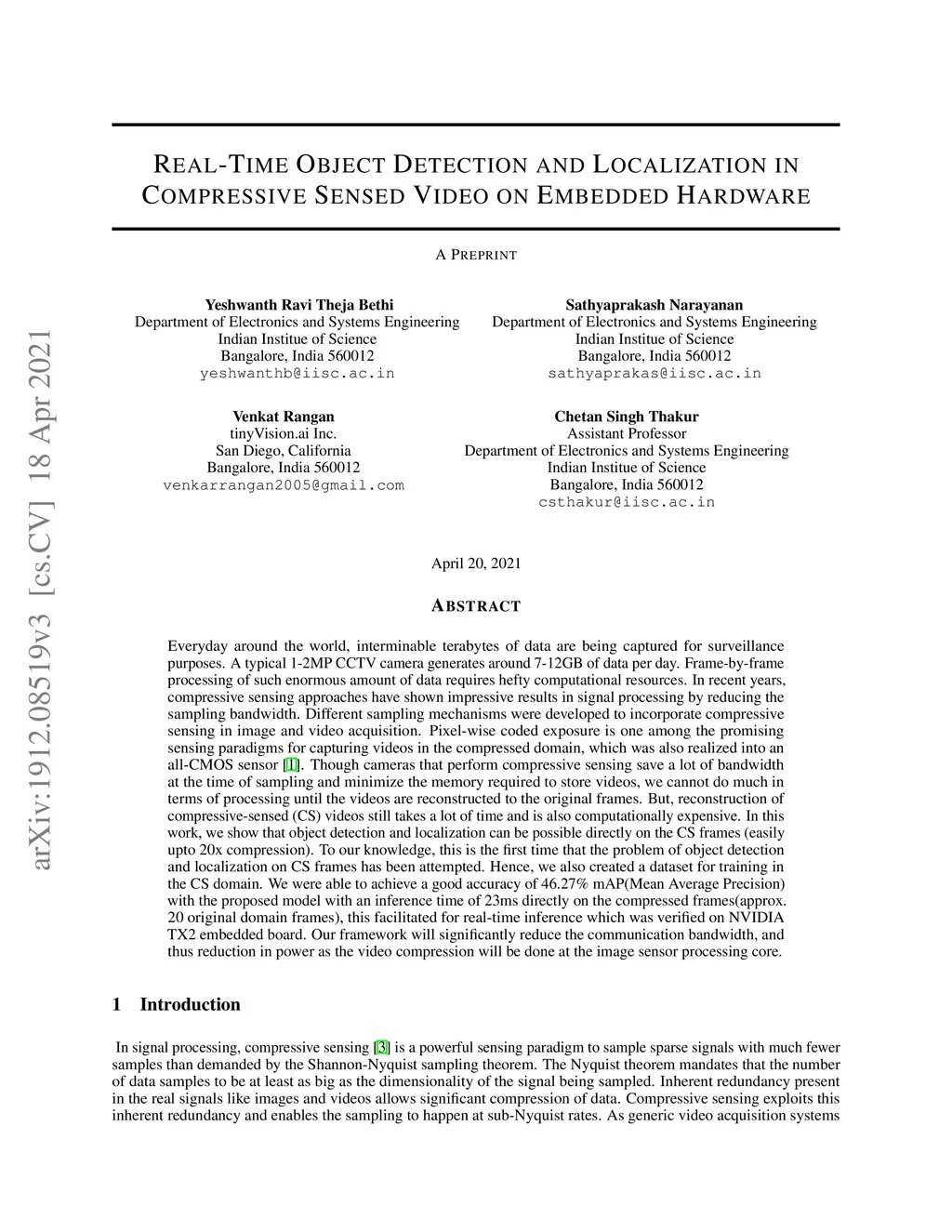Every day around the world, interminable terabytes of data are being captured for surveillance purposes. A typical 1-2MP CCTV camera generates around 7-12GB of data per day. Frame-by-frame processing of such enormous amount of data requires hefty computational resources. In recent years, compressive sensing approaches have shown impressive results in signal processing by reducing the sampling bandwidth. Different sampling mechanisms were developed to incorporate compressive sensing in image and video acquisition. Pixel-wise coded exposure is one among the promising sensing paradigms for capturing videos in the compressed domain, which was also realized into an all-CMOS sensor \cite{Xiong2017}. Though cameras that perform compressive sensing save a lot of bandwidth at the time of sampling and minimize the memory required to store videos, we cannot do much in terms of processing until the videos are reconstructed to the original frames. But, the reconstruction of compressive-sensed (CS) videos still takes a lot of time and is also computationally expensive. In this work, we show that object detection and localization can be possible directly on the CS frames (easily upto 20x compression). To our knowledge, this is the first time that the problem of object detection and localization on CS frames has been attempted. Hence, we also created a dataset for training in the CS domain. We were able to achieve a good accuracy of 46.27\% mAP(Mean Average Precision) with the proposed model with an inference time of 23ms directly on the compressed frames(approx. 20 original domain frames), this facilitated for real-time inference which was verified on NVIDIA TX2 embedded board. Our framework will significantly reduce the communication bandwidth, and thus reduction in power as the video compression will be done at the image sensor processing core.