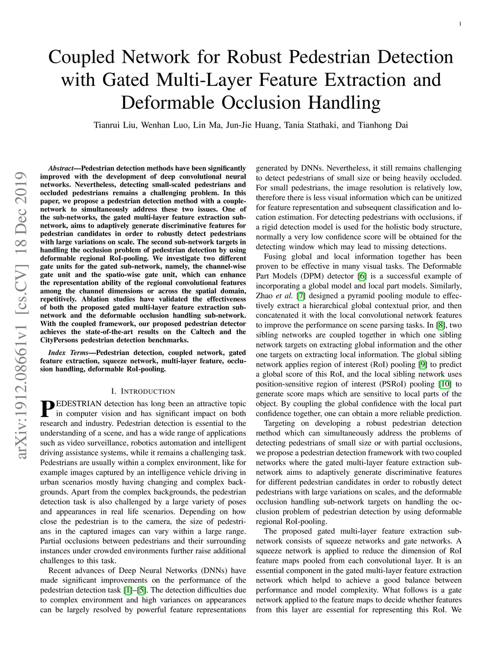 Pedestrian detection methods have been significantly improved with the development of deep convolutional neural networks. Nevertheless, detecting small-scaled pedestrians and occluded pedestrians remains a challenging problem. In this paper, we propose a pedestrian detection method with a couple-network to simultaneously address these two issues. One of the sub-networks, the gated multi-layer feature extraction sub-network, aims to adaptively generate discriminative features for pedestrian candidates in order to robustly detect pedestrians with large variations on scales. The second sub-network targets in handling the occlusion problem of pedestrian detection by using deformable regional RoI-pooling. We investigate two different gate units for the gated sub-network, namely, the channel-wise gate unit and the spatio-wise gate unit, which can enhance the representation ability of the regional convolutional features among the channel dimensions or across the spatial domain, repetitively. Ablation studies have validated the effectiveness of both the proposed gated multi-layer feature extraction sub-network and the deformable occlusion handling sub-network. With the coupled framework, our proposed pedestrian detector achieves state-of-the-art results on the Caltech and the CityPersons pedestrian detection benchmarks.