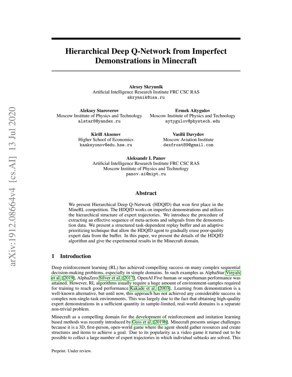 We present Hierarchical Deep Q-Network (HDQfD) that took first place in the MineRL competition. HDQfD works on imperfect demonstrations and utilizes the hierarchical structure of expert trajectories. We introduce the procedure of extracting an effective sequence of meta-actions and subgoals from demonstration data. We present a structured task-dependent replay buffer and adaptive prioritizing technique that allow the HDQfD agent to gradually erase poor-quality expert data from the buffer. In this paper, we present the details of the HDQfD algorithm and give the experimental results in the Minecraft domain.