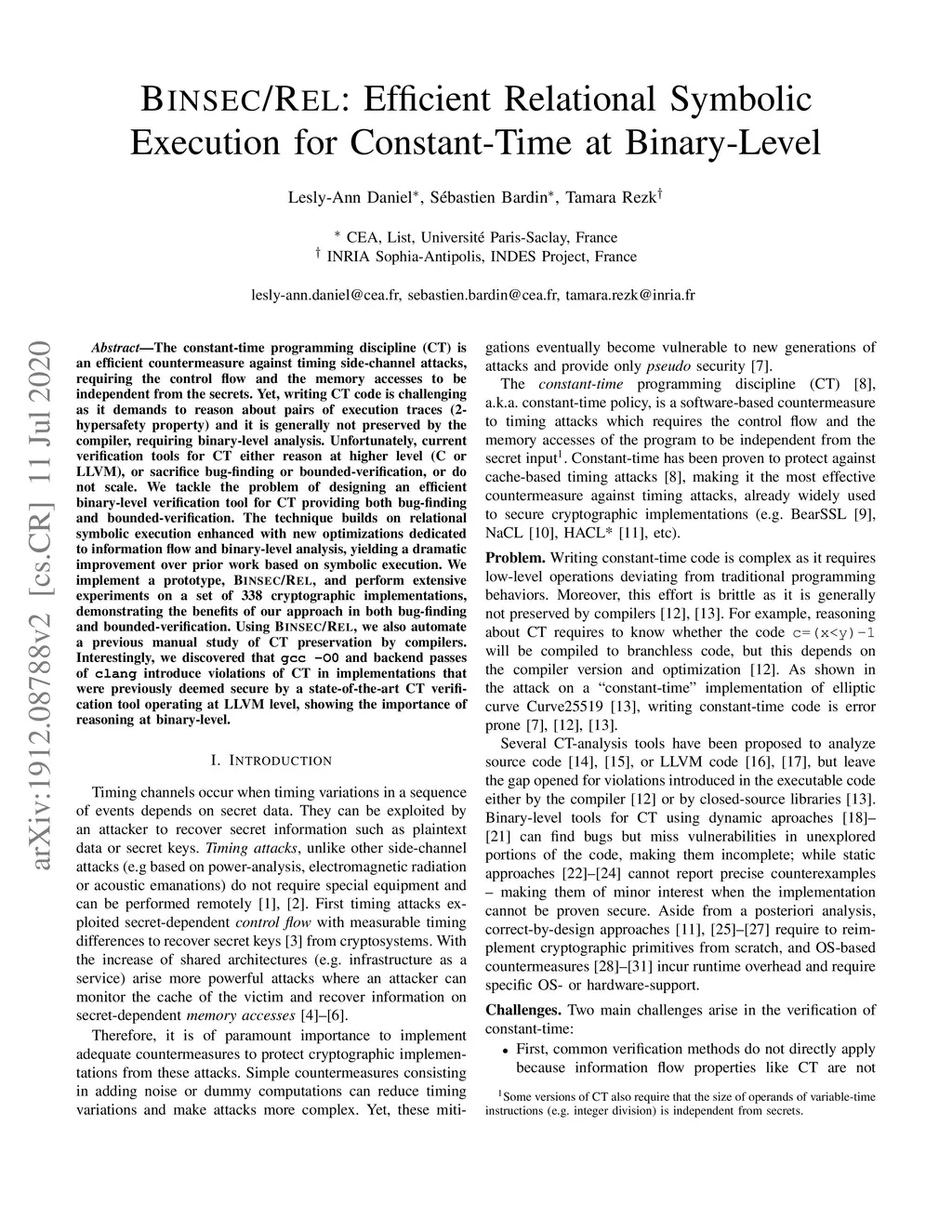 The constant-time programming discipline (CT) is an efficient countermeasure against timing side-channel attacks, requiring the control flow and the memory accesses to be independent from the secrets. Yet, writing CT code is challenging as it demands to reason about pairs of execution traces (2- hypersafety property) and it is generally not preserved by the compiler, requiring binary-level analysis. Unfortunately, current verification tools for CT either reason at higher level (C or LLVM), or sacrifice bug-finding or bounded-verification, or do not scale. We tackle the problem of designing an efficient binary-level verification tool for CT providing both bug-finding and bounded-verification. The technique builds on relational symbolic execution enhanced with new optimizations dedicated to information flow and binary-level analysis, yielding a dramatic improvement over prior work based on symbolic execution. We implement a prototype, Binsec/Rel, and perform extensive experiments on a set of 338 cryptographic implementations, demonstrating the benefits of our approach in both bug-finding and bounded-verification. Using Binsec/Rel, we also automate a previous manual study of CT preservation by compilers. Interestingly, we discovered that gcc -O0 and backend passes of clang introduce violations of CT in implementations that were previously deemed secure by a state-of-the-art CT verification tool operating at LLVM level, showing the importance of reasoning at binary-level.