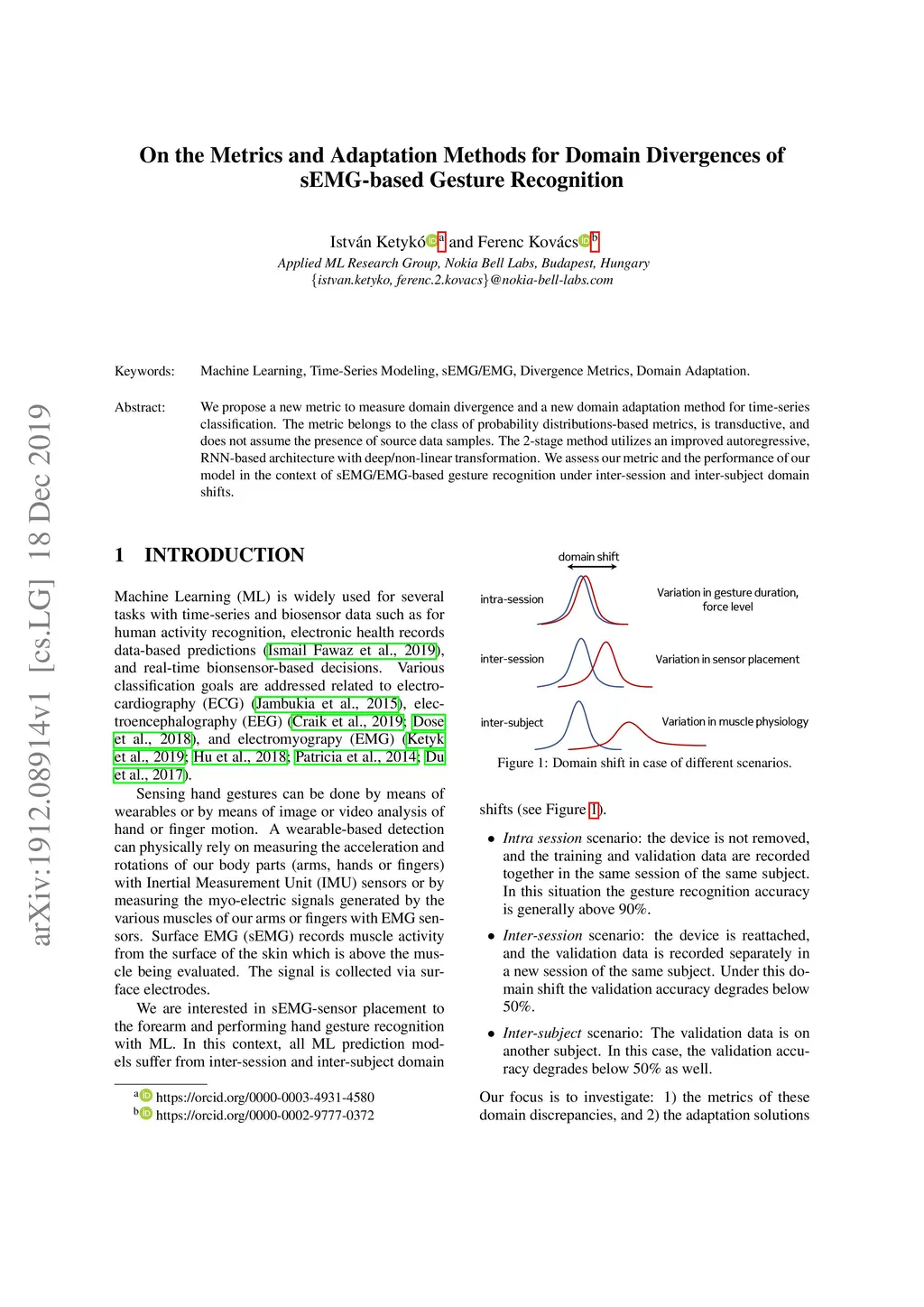 We propose a new metric to measure domain divergence and a new domain adaptation method for time-series classification. The metric belongs to the class of probability distributions-based metrics, is transductive, and does not assume the presence of source data samples. The 2-stage method utilizes an improved autoregressive, RNN-based architecture with deep/non-linear transformation. We assess our metric and the performance of our model in the context of sEMG/EMG-based gesture recognition under inter-session and inter-subject domain shifts.