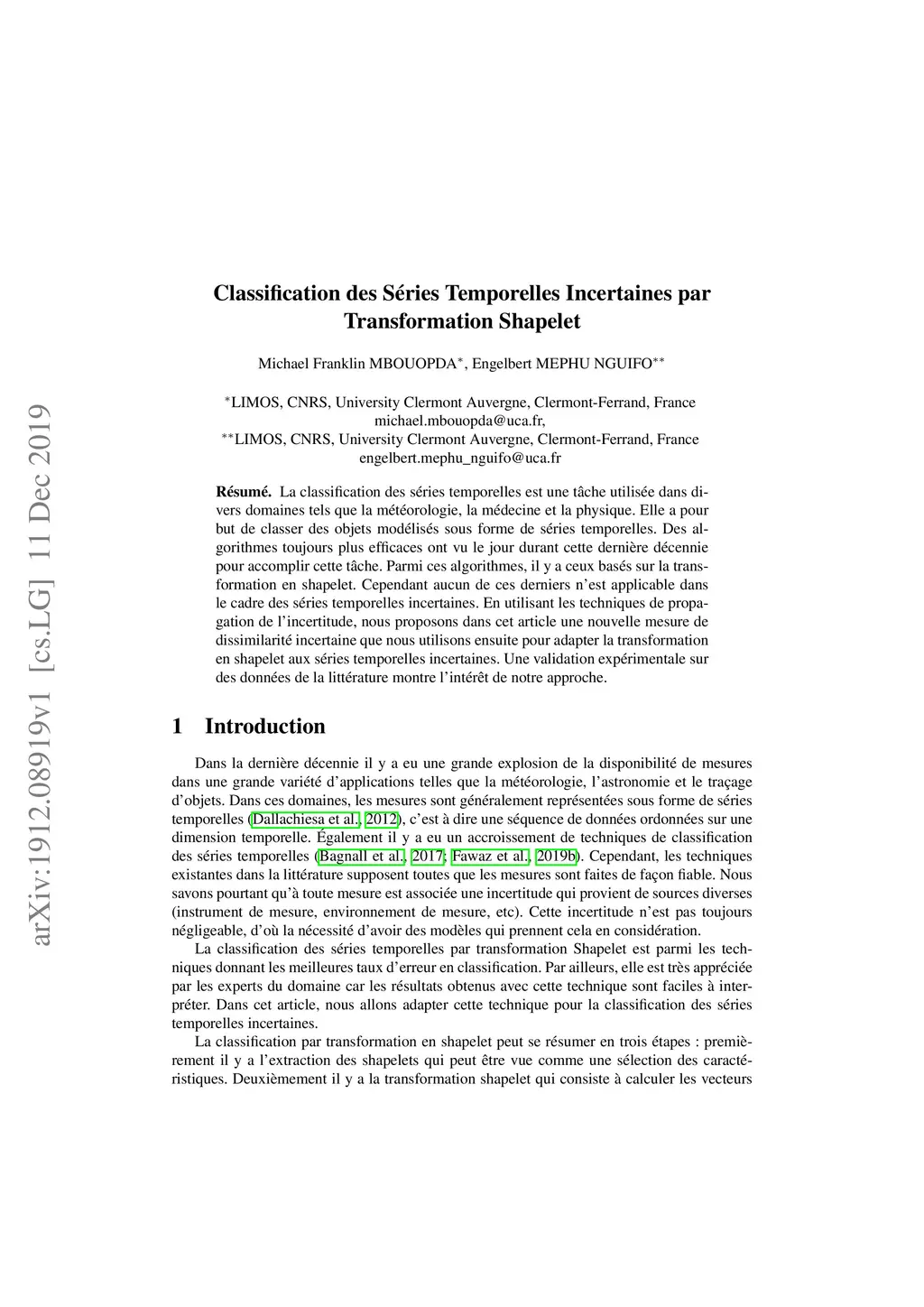 Classification des S{é}ries Temporelles Incertaines par Transformation