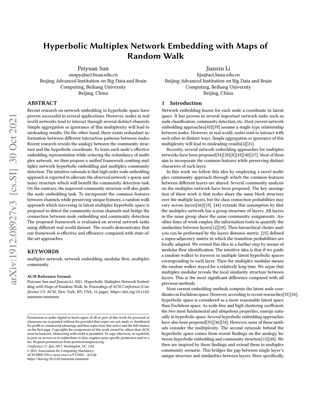 Hyperbolic Multiplex Network Embedding with Maps of Random Walk