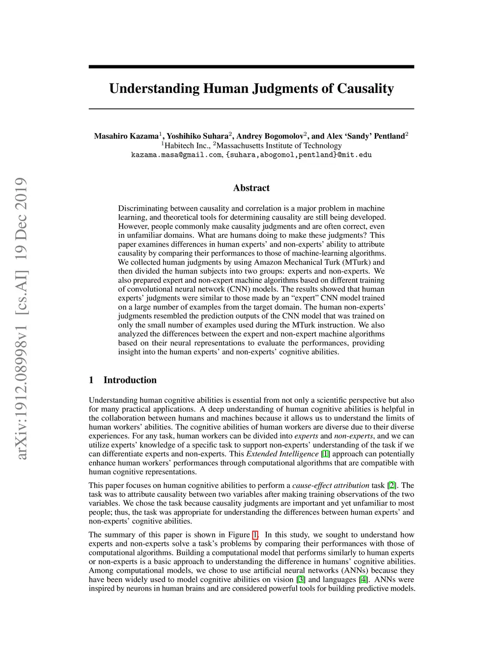 Discriminating between causality and correlation is a major problem in machine learning, and theoretical tools for determining causality are still being developed. However, people commonly make causality judgments and are often correct, even in unfamiliar domains. What are humans doing to make these judgments? This paper examines differences in human experts' and non-experts' ability to attribute causality by comparing their performances to those of machine-learning algorithms. We collected human judgments by using Amazon Mechanical Turk (MTurk) and then divided the human subjects into two groups: experts and non-experts. We also prepared expert and non-expert machine algorithms based on different training of convolutional neural network (CNN) models. The results showed that human experts' judgments were similar to those made by an "expert" CNN model trained on a large number of examples from the target domain. The human non-experts' judgments resembled the prediction outputs of the CNN model that was trained on only the small number of examples used during the MTurk instruction. We also analyzed the differences between the expert and non-expert machine algorithms based on their neural representations to evaluate the performances, providing insight into the human experts' and non-experts' cognitive abilities.