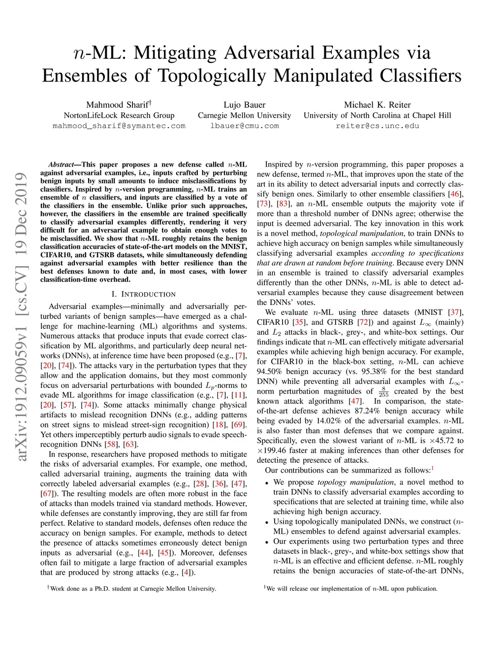 This paper proposes a new defense called -ML against adversarial examples, i.e., inputs crafted by perturbing benign inputs by small amounts to induce misclassifications by classifiers. Inspired by -version programming, -ML trains an ensemble of classifiers, and inputs are classified by a vote of the classifiers in the ensemble. Unlike prior such approaches, however, the classifiers in the ensemble are trained specifically to classify adversarial examples differently, rendering it very difficult for an adversarial example to obtain enough votes to be misclassified. We show that -ML roughly retains the benign classification accuracies of state-of-the-art models on the MNIST, CIFAR10, and GTSRB datasets, while simultaneously defending against adversarial examples with better resilience than the best defenses known to date and, in most cases, with lower classification-time overhead.