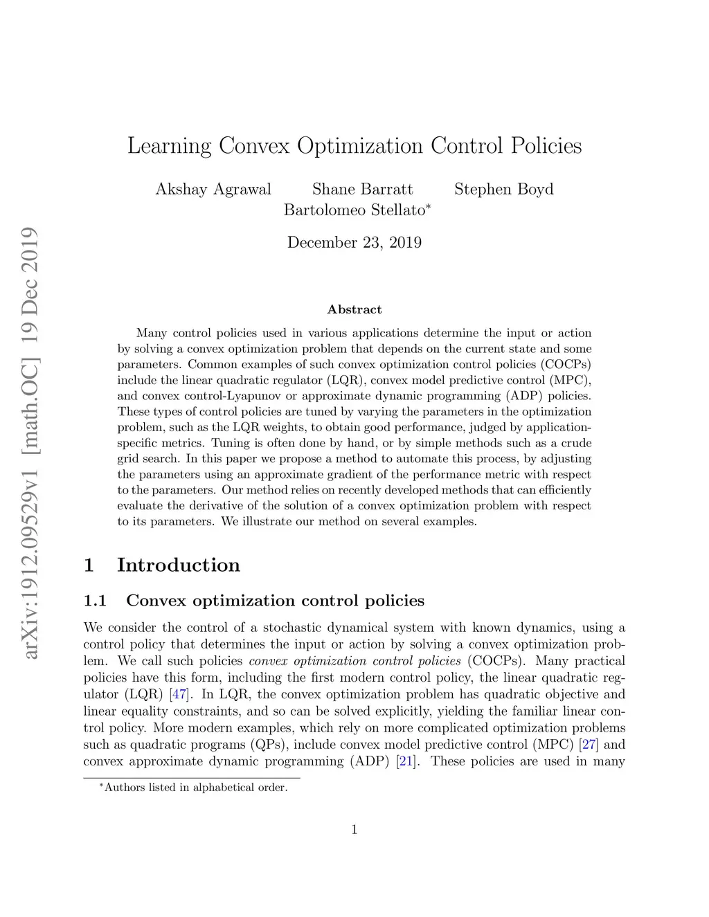 Many control policies used in various applications determine the input or action by solving a convex optimization problem that depends on the current state and some parameters. Common examples of such convex optimization control policies (COCPs) include the linear quadratic regulator (LQR), convex model predictive control (MPC), and convex control-Lyapunov or approximate dynamic programming (ADP) policies. These types of control policies are tuned by varying the parameters in the optimization problem, such as the LQR weights, to obtain good performance, judged by application-specific metrics. Tuning is often done by hand, or by simple methods such as a crude grid search. In this paper we propose a method to automate this process, by adjusting the parameters using an approximate gradient of the performance metric with respect to the parameters. Our method relies on recently developed methods that can efficiently evaluate the derivative of the solution of a convex optimization problem with respect to its parameters. We illustrate our method on several examples.