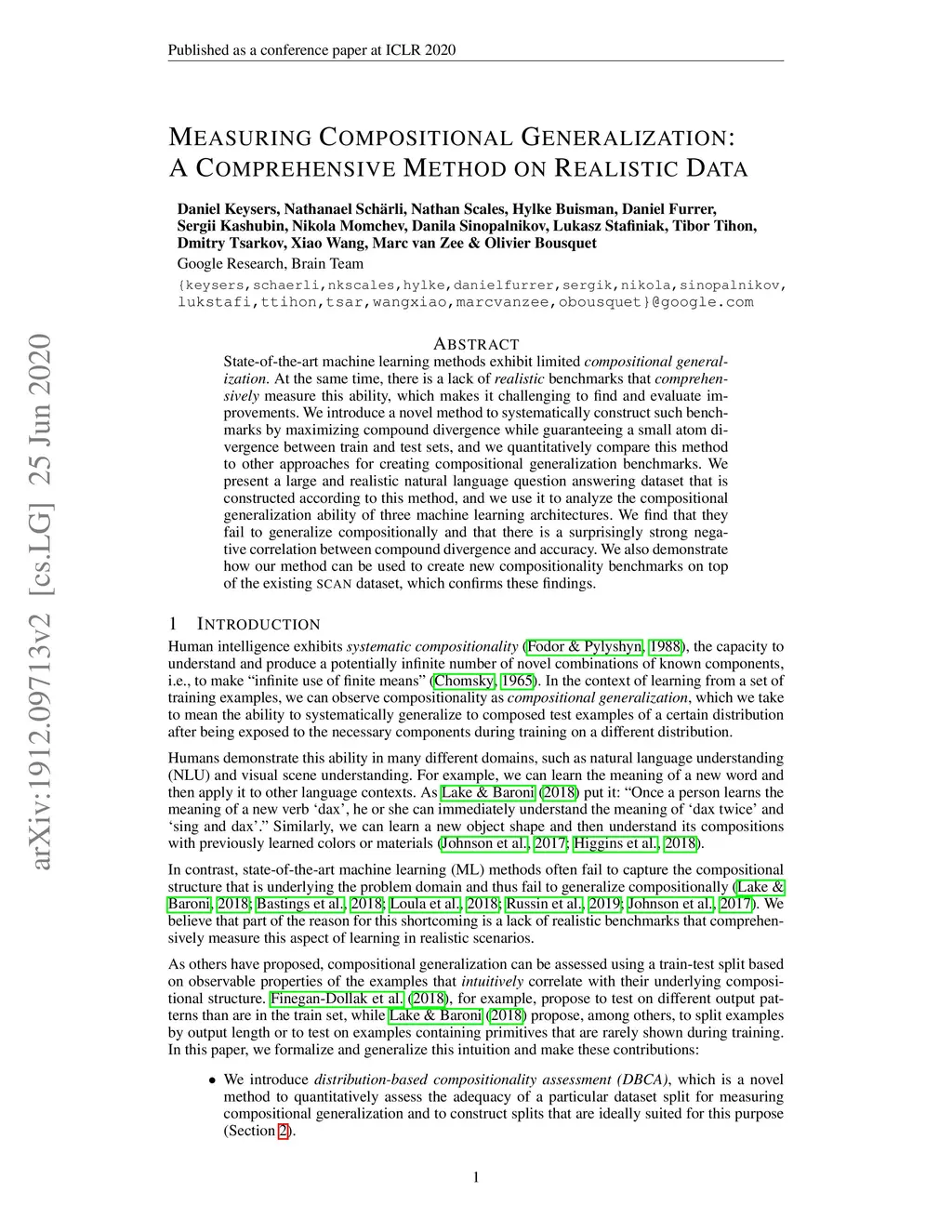 State-of-the-art machine learning methods exhibit limited compositional generalization. At the same time, there is a lack of realistic benchmarks that comprehensively measure this ability, which makes it challenging to find and evaluate improvements. We introduce a novel method to systematically construct such benchmarks by maximizing compound divergence while guaranteeing a small atom divergence between train and test sets, and we quantitatively compare this method to other approaches for creating compositional generalization benchmarks. We present a large and realistic natural language question answering dataset that is constructed according to this method, and we use it to analyze the compositional generalization ability of three machine learning architectures. We find that they fail to generalize compositionally and that there is a surprisingly strong negative correlation between compound divergence and accuracy. We also demonstrate how our method can be used to create new compositionality benchmarks on top of the existing SCAN dataset, which confirms these findings.