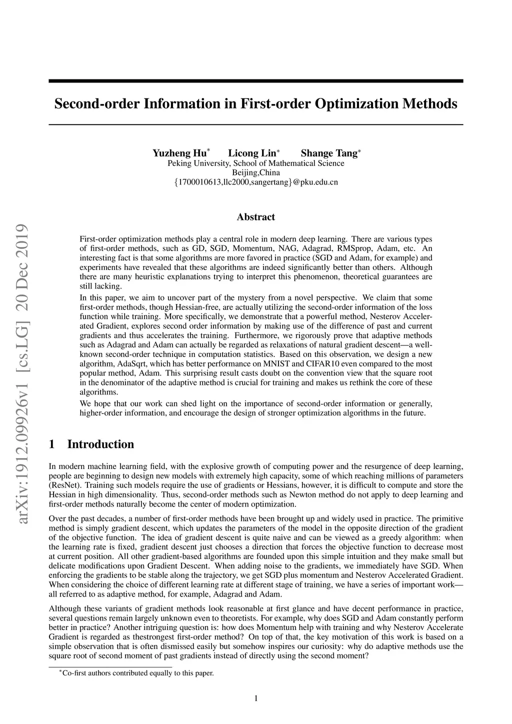 In this paper, we try to uncover the second-order essence of several first-order optimization methods. For Nesterov Accelerated Gradient, we rigorously prove that the algorithm makes use of the difference between past and current gradients, thus approximates the Hessian and accelerates the training. For adaptive methods, we related Adam and Adagrad to a powerful technique in computation statistics---Natural Gradient Descent. These adaptive methods can in fact be treated as relaxations of NGD with only a slight difference lying in the square root of the denominator in the update rules. Skeptical about the effect of such difference, we design a new algorithm---AdaSqrt, which removes the square root in the denominator and scales the learning rate by sqrt(T). Surprisingly, our new algorithm is comparable to various first-order methods(such as SGD and Adam) on MNIST and even beats Adam on CIFAR-10! This phenomenon casts doubt on the convention view that the square root is crucial and training without it will lead to terrible performance. As far as we have concerned, so long as the algorithm tries to explore second or even higher information of the loss surface, then proper scaling of the learning rate alone will guarantee fast training and good generalization performance. To the best of our knowledge, this is the first paper that seriously considers the necessity of square root among all adaptive methods. We believe that our work can shed light on the importance of higher-order information and inspire the design of more powerful algorithms in the future.