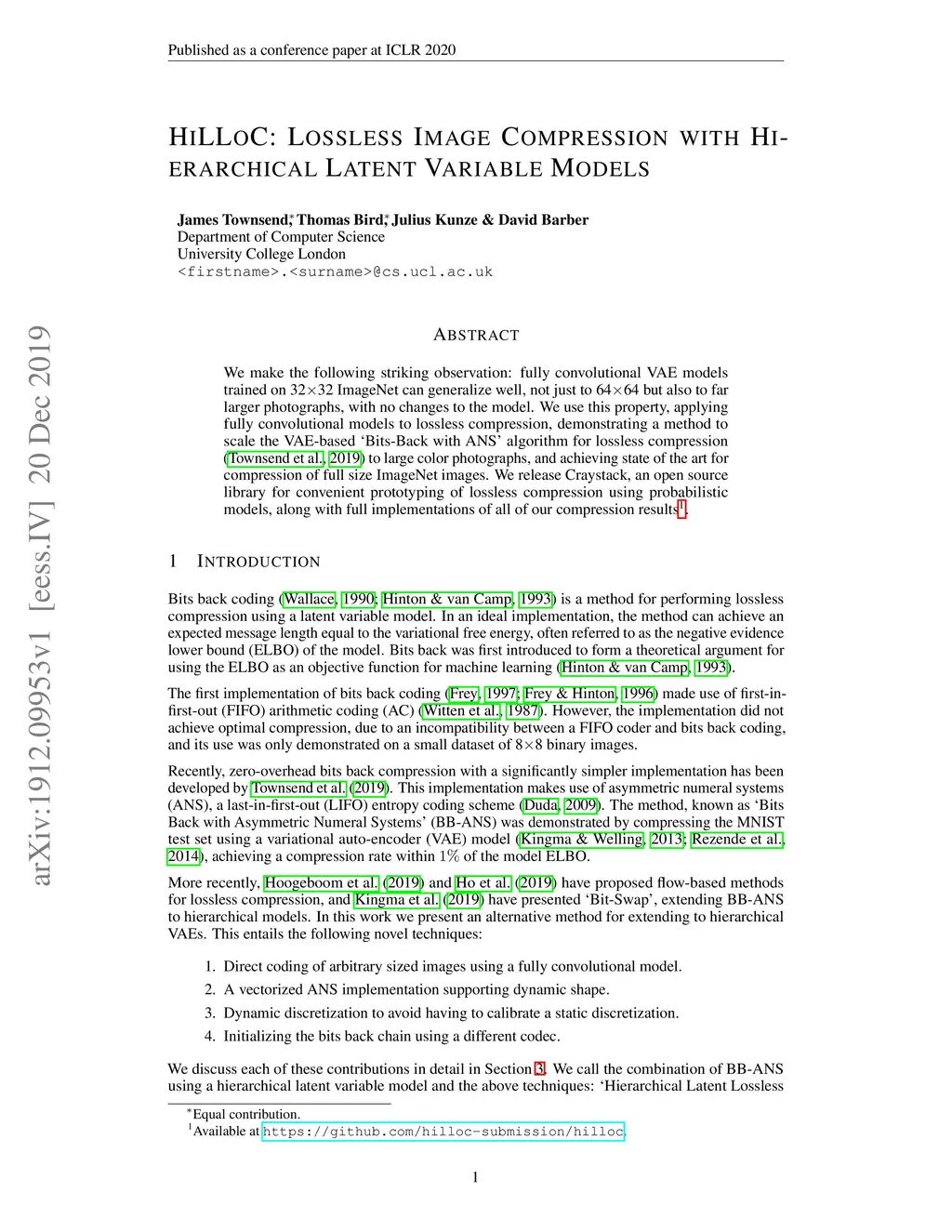 We make the following striking observation: fully convolutional VAE models trained on 32x32 ImageNet can generalize well, not just to 64x64 but also to far larger photographs, with no changes to the model. We use this property, applying fully convolutional models to lossless compression, demonstrating a method to scale the VAE-based 'Bits-Back with ANS' algorithm for lossless compression to large color photographs, and achieving state of the art for compression of full size ImageNet images. We release Craystack, an open source library for convenient prototyping of lossless compression using probabilistic models, along with full implementations of all of our compression results.