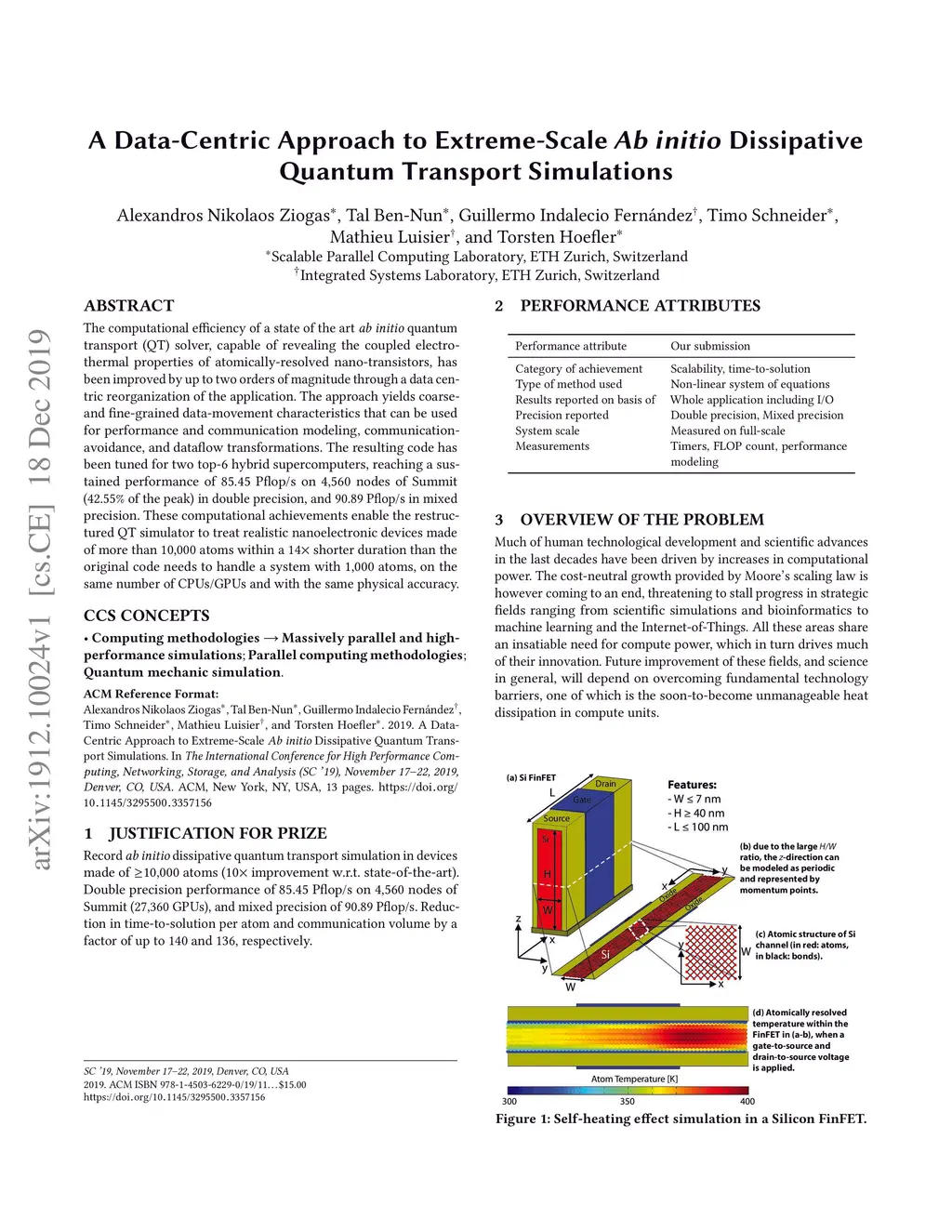 The computational efficiency of a state of the art ab initio quantum transport (QT) solver, capable of revealing the coupled electro-thermal properties of atomically-resolved nano-transistors, has been improved by up to two orders of magnitude through a data centric reorganization of the application. The approach yields coarse-and fine-grained data-movement characteristics that can be used for performance and communication modeling, communication-avoidance, and dataflow transformations. The resulting code has been tuned for two top-6 hybrid supercomputers, reaching a sustained performance of 85.45 Pflop/s on 4,560 nodes of Summit (42.55% of the peak) in double precision, and 90.89 Pflop/s in mixed precision. These computational achievements enable the restructured QT simulator to treat realistic nanoelectronic devices made of more than 10,000 atoms within a 14 shorter duration than the original code needs to handle a system with 1,000 atoms, on the same number of CPUs/GPUs and with the same physical accuracy.