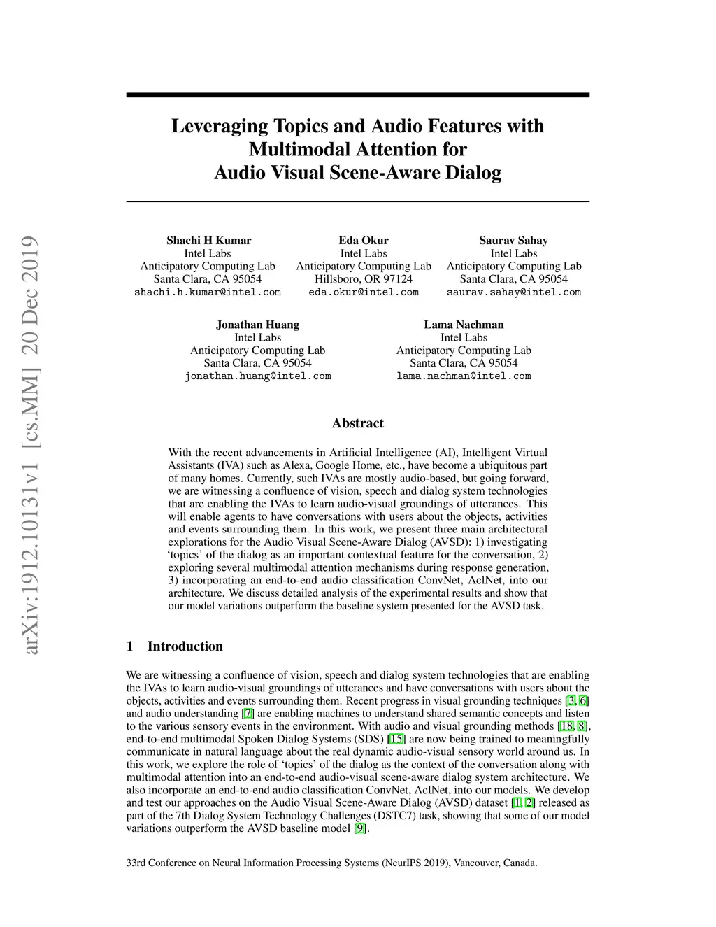 With the recent advancements in Artificial Intelligence (AI), Intelligent Virtual Assistants (IVA) such as Alexa, Google Home, etc., have become a ubiquitous part of many homes. Currently, such IVAs are mostly audio-based, but going forward, we are witnessing a confluence of vision, speech and dialog system technologies that are enabling the IVAs to learn audio-visual groundings of utterances. This will enable agents to have conversations with users about the objects, activities and events surrounding them. In this work, we present three main architectural explorations for the Audio Visual Scene-Aware Dialog (AVSD): 1) investigating `topics' of the dialog as an important contextual feature for the conversation, 2) exploring several multimodal attention mechanisms during response generation, 3) incorporating an end-to-end audio classification ConvNet, AclNet, into our architecture. We discuss detailed analysis of the experimental results and show that our model variations outperform the baseline system presented for the AVSD task.