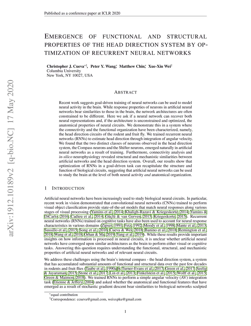 Recent work suggests goal-driven training of neural networks can be used to model neural activity in the brain. While response properties of neurons in artificial neural networks bear similarities to those in the brain, the network architectures are often constrained to be different. Here we ask if a neural network can recover both neural representations and, if the architecture is unconstrained and optimized, the anatomical properties of neural circuits. We demonstrate this in a system where the connectivity and the functional organization have been characterized, namely, the head direction circuits of the rodent and fruit fly. We trained recurrent neural networks (RNNs) to estimate head direction through integration of angular velocity. We found that the two distinct classes of neurons observed in the head direction system, the Compass neurons and the Shifter neurons, emerged naturally in artificial neural networks as a result of training. Furthermore, connectivity analysis and in-silico neurophysiology revealed structural and mechanistic similarities between artificial networks and the head direction system. Overall, our results show that optimization of RNNs in a goal-driven task can recapitulate the structure and function of biological circuits, suggesting that artificial neural networks can be used to study the brain at the level of both neural activity and anatomical organization.