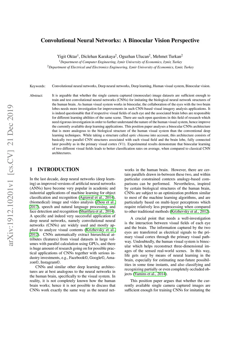 It is arguable that whether the single camera captured (monocular) image datasets are sufficient enough to train and test convolutional neural networks (CNNs) for imitating the biological neural network structures of the human brain. As human visual system works in binocular, the collaboration of the eyes with the two brain lobes needs more investigation for improvements in such CNN-based visual imagery analysis applications. It is indeed questionable that if respective visual fields of each eye and the associated brain lobes are responsible for different learning abilities of the same scene. There are such open questions in this field of research which need rigorous investigation in order to further understand the nature of the human visual system, hence improve the currently available deep learning applications. This position paper analyses a binocular CNNs architecture that is more analogous to the biological structure of the human visual system than the conventional deep learning techniques. While taking a structure called optic chiasma into account, this architecture consists of basically two parallel CNN structures associated with each visual field and the brain lobe, fully connected later possibly as in the primary visual cortex (V1). Experimental results demonstrate that binocular learning of two different visual fields leads to better classification rates on average, when compared to classical CNN architectures.