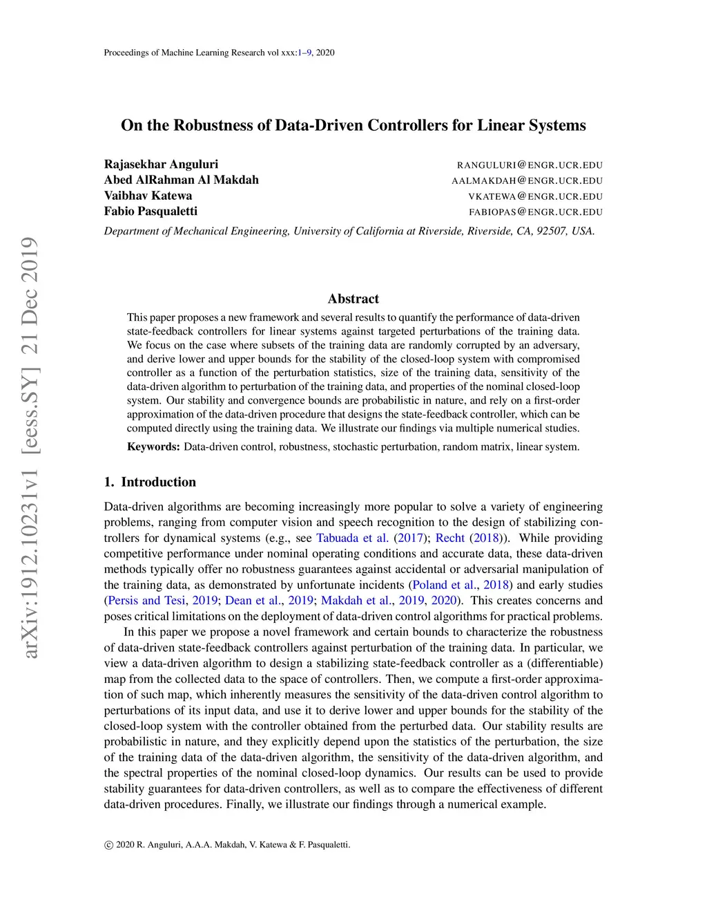 This paper proposes a new framework and several results to quantify the performance of data-driven state-feedback controllers for linear systems against targeted perturbations of the training data. We focus on the case where subsets of the training data are randomly corrupted by an adversary, and derive lower and upper bounds for the stability of the closed-loop system with compromised controller as a function of the perturbation statistics, size of the training data, sensitivity of the data-driven algorithm to perturbation of the training data, and properties of the nominal closed-loop system. Our stability and convergence bounds are probabilistic in nature, and rely on a first-order approximation of the data-driven procedure that designs the state-feedback controller, which can be computed directly using the training data. We illustrate our findings via multiple numerical studies.