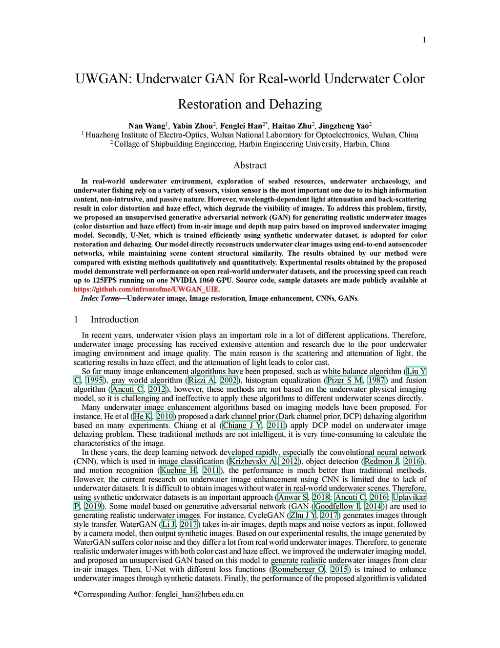 In real-world underwater environment, exploration of seabed resources, underwater archaeology, and underwater fishing rely on a variety of sensors, vision sensor is the most important one due to its high information content, non-intrusive, and passive nature. However, wavelength-dependent light attenuation and back-scattering result in color distortion and haze effect, which degrade the visibility of images. To address this problem, firstly, we proposed an unsupervised generative adversarial network (GAN) for generating realistic underwater images (color distortion and haze effect) from in-air image and depth map pairs based on improved underwater imaging model. Secondly, U-Net, which is trained efficiently using synthetic underwater dataset, is adopted for color restoration and dehazing. Our model directly reconstructs underwater clear images using end-to-end autoencoder networks, while maintaining scene content structural similarity. The results obtained by our method were compared with existing methods qualitatively and quantitatively. Experimental results obtained by the proposed model demonstrate well performance on open real-world underwater datasets, and the processing speed can reach up to 125FPS running on one NVIDIA 1060 GPU. Source code, sample datasets are made publicly available at https://github.com/infrontofme/UWGAN_UIE.