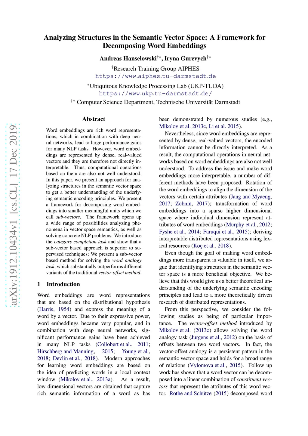 Word embeddings are rich word representations, which in combination with deep neural networks, lead to large performance gains for many NLP tasks. However, word embeddings are represented by dense, real-valued vectors and they are therefore not directly interpretable. Thus, computational operations based on them are also not well understood. In this paper, we present an approach for analyzing structures in the semantic vector space to get a better understanding of the underlying semantic encoding principles. We present a framework for decomposing word embeddings into smaller meaningful units which we call sub-vectors. The framework opens up a wide range of possibilities analyzing phenomena in vector space semantics, as well as solving concrete NLP problems: We introduce the category completion task and show that a sub-vector based approach is superior to supervised techniques; We present a sub-vector based method for solving the word analogy task, which substantially outperforms different variants of the traditional vector-offset method.
