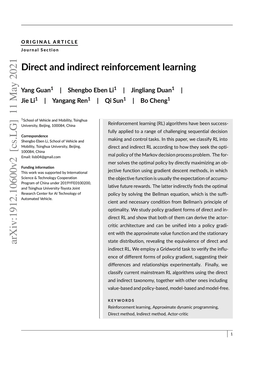 Reinforcement learning (RL) algorithms have been successfully applied to a range of challenging sequential decision making and control tasks. In this paper, we classify RL into direct and indirect RL according to how they seek the optimal policy of the Markov decision process problem. The former solves the optimal policy by directly maximizing an objective function using gradient descent methods, in which the objective function is usually the expectation of accumulative future rewards. The latter indirectly finds the optimal policy by solving the Bellman equation, which is the sufficient and necessary condition from Bellman's principle of optimality. We study policy gradient forms of direct and indirect RL and show that both of them can derive the actor-critic architecture and can be unified into a policy gradient with the approximate value function and the stationary state distribution, revealing the equivalence of direct and indirect RL. We employ a Gridworld task to verify the influence of different forms of policy gradient, suggesting their differences and relationships experimentally. Finally, we classify current mainstream RL algorithms using the direct and indirect taxonomy, together with other ones including value-based and policy-based, model-based and model-free.