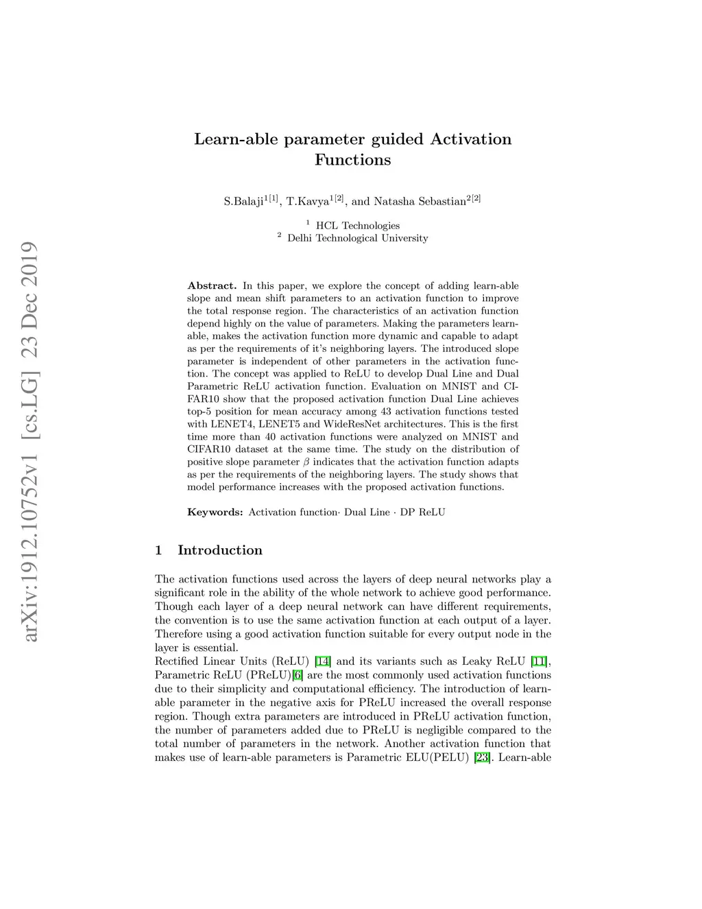 In this paper, we explore the concept of adding learn-able slope and mean shift parameters to an activation function to improve the total response region. The characteristics of an activation function depend highly on the value of parameters. Making the parameters learn-able, makes the activation function more dynamic and capable to adapt as per the requirements of its neighboring layers. The introduced slope parameter is independent of other parameters in the activation function. The concept was applied to ReLU to develop Dual Line and DualParametric ReLU activation function. Evaluation on MNIST and CIFAR10 show that the proposed activation function Dual Line achieves top-5 position for mean accuracy among 43 activation functions tested with LENET4, LENET5, and WideResNet architectures. This is the first time more than 40 activation functions were analyzed on MNIST andCIFAR10 dataset at the same time. The study on the distribution of positive slope parameter beta indicates that the activation function adapts as per the requirements of the neighboring layers. The study shows that model performance increases with the proposed activation functions