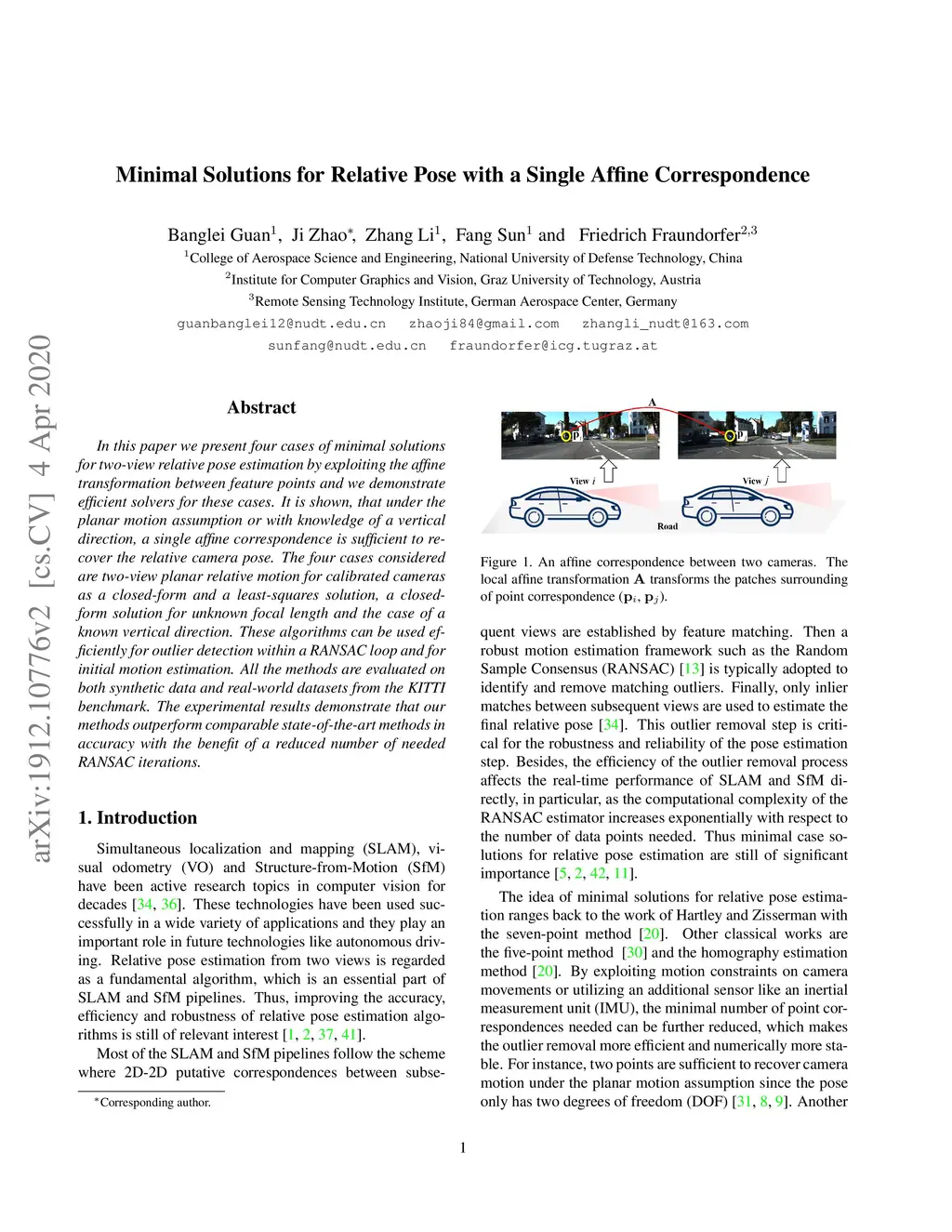 In this paper we present four cases of minimal solutions for two-view relative pose estimation by exploiting the affine transformation between feature points and we demonstrate efficient solvers for these cases. It is shown, that under the planar motion assumption or with knowledge of a vertical direction, a single affine correspondence is sufficient to recover the relative camera pose. The four cases considered are two-view planar relative motion for calibrated cameras as a closed-form and a least-squares solution, a closed-form solution for unknown focal length and the case of a known vertical direction. These algorithms can be used efficiently for outlier detection within a RANSAC loop and for initial motion estimation. All the methods are evaluated on both synthetic data and real-world datasets from the KITTI benchmark. The experimental results demonstrate that our methods outperform comparable state-of-the-art methods in accuracy with the benefit of a reduced number of needed RANSAC iterations.