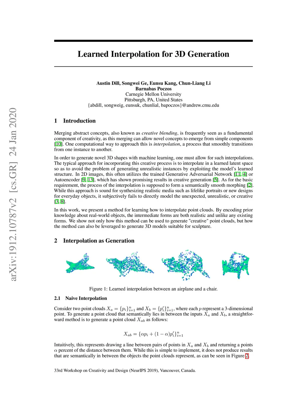 In order to generate novel 3D shapes with machine learning, one must allow for interpolation. The typical approach for incorporating this creative process is to interpolate in a learned latent space so as to avoid the problem of generating unrealistic instances by exploiting the model's learned structure. The process of the interpolation is supposed to form a semantically smooth morphing. While this approach is sound for synthesizing realistic media such as lifelike portraits or new designs for everyday objects, it subjectively fails to directly model the unexpected, unrealistic, or creative. In this work, we present a method for learning how to interpolate point clouds. By encoding prior knowledge about real-world objects, the intermediate forms are both realistic and unlike any existing forms. We show not only how this method can be used to generate "creative" point clouds, but how the method can also be leveraged to generate 3D models suitable for sculpture.