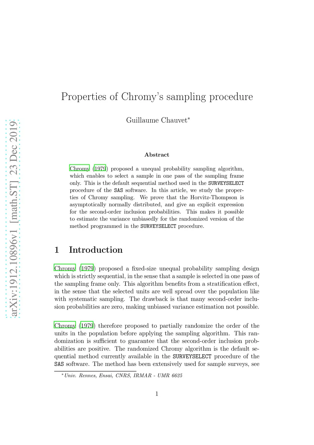 Chromy (1979) proposed a unequal probability sampling algorithm, which enables to select a sample in one pass of the sampling frame only. This is the default sequential method used in the SURVEYSELECT procedure of the SAS software. In this article, we study the properties of Chromy sampling. We prove that the Horvitz-Thompson is asymptotically normally distributed, and give an explicit expression for the second-order inclusion probabilities. This makes it possible to estimate the variance unbiasedly for the randomized version of the method programmed in the SURVEYSELECT procedure.