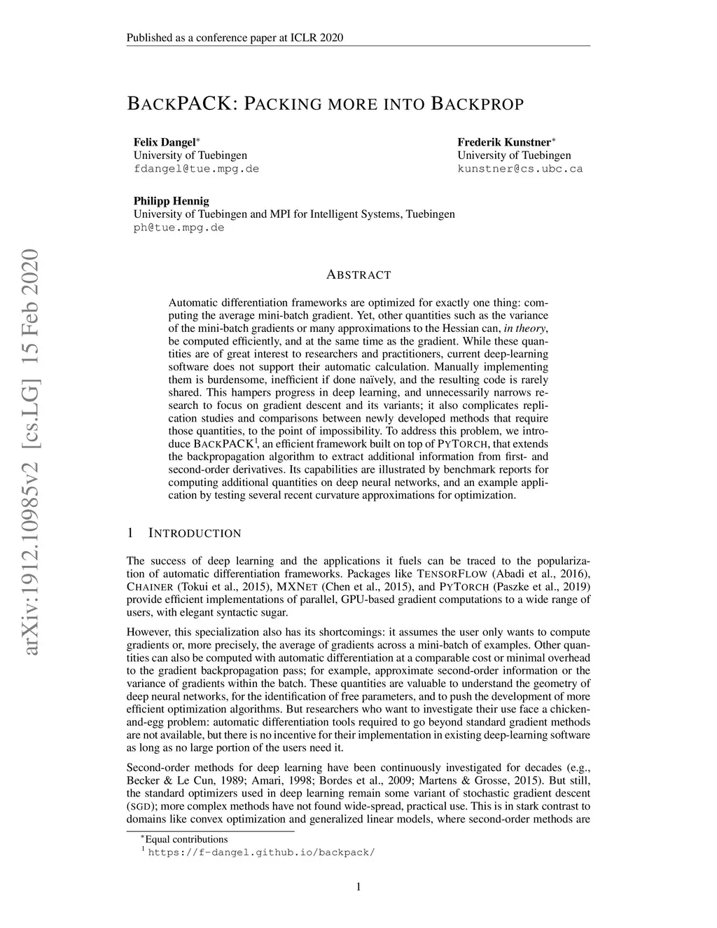 Automatic differentiation frameworks are optimized for exactly one thing: computing the average mini-batch gradient. Yet, other quantities such as the variance of the mini-batch gradients or many approximations to the Hessian can, in theory, be computed efficiently, and at the same time as the gradient. While these quantities are of great interest to researchers and practitioners, current deep-learning software does not support their automatic calculation. Manually implementing them is burdensome, inefficient if done naively, and the resulting code is rarely shared. This hampers progress in deep learning, and unnecessarily narrows research to focus on gradient descent and its variants; it also complicates replication studies and comparisons between newly developed methods that require those quantities, to the point of impossibility. To address this problem, we introduce BackPACK, an efficient framework built on top of PyTorch, that extends the backpropagation algorithm to extract additional information from first- and second-order derivatives. Its capabilities are illustrated by benchmark reports for computing additional quantities on deep neural networks, and an example application by testing several recent curvature approximations for optimization.