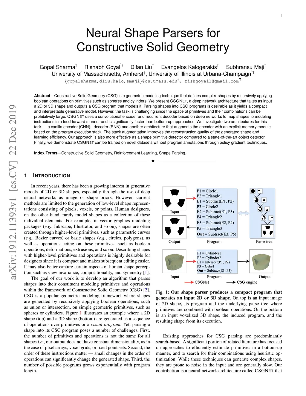 Constructive Solid Geometry (CSG) is a geometric modeling technique that defines complex shapes by recursively applying boolean operations on primitives such as spheres and cylinders. We present CSGNe, a deep network architecture that takes as input a 2D or 3D shape and outputs a CSG program that models it. Parsing shapes into CSG programs is desirable as it yields a compact and interpretable generative model. However, the task is challenging since the space of primitives and their combinations can be prohibitively large. CSGNe uses a convolutional encoder and recurrent decoder based on deep networks to map shapes to modeling instructions in a feed-forward manner and is significantly faster than bottom-up approaches. We investigate two architectures for this task --- a vanilla encoder (CNN) - decoder (RNN) and another architecture that augments the encoder with an explicit memory module based on the program execution stack. The stack augmentation improves the reconstruction quality of the generated shape and learning efficiency. Our approach is also more effective as a shape primitive detector compared to a state-of-the-art object detector. Finally, we demonstrate CSGNet can be trained on novel datasets without program annotations through policy gradient techniques.