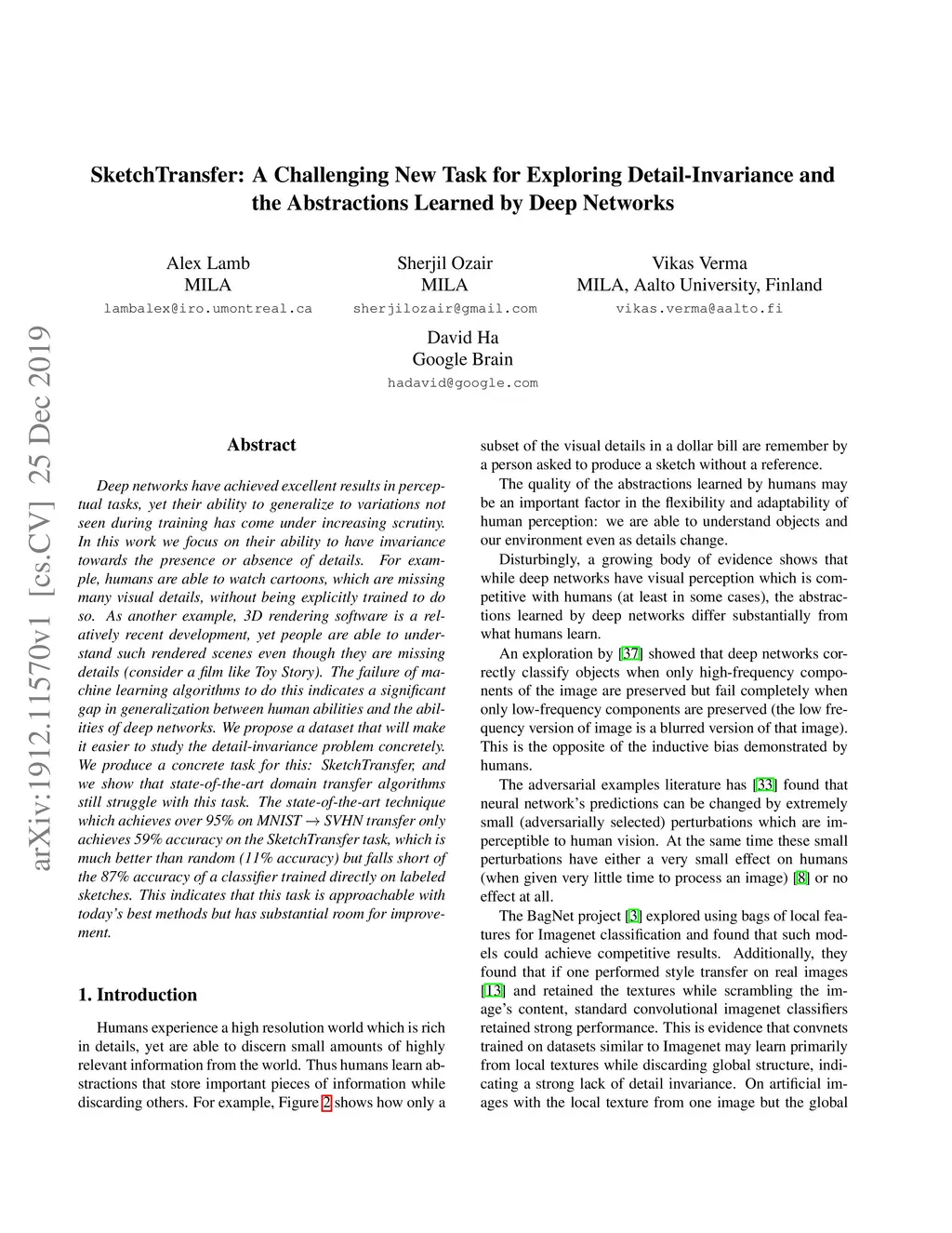 Deep networks have achieved excellent results in perceptual tasks, yet their ability to generalize to variations not seen during training has come under increasing scrutiny. In this work we focus on their ability to have invariance towards the presence or absence of details. For example, humans are able to watch cartoons, which are missing many visual details, without being explicitly trained to do so. As another example, 3D rendering software is a relatively recent development, yet people are able to understand such rendered scenes even though they are missing details (consider a film like Toy Story). The failure of machine learning algorithms to do this indicates a significant gap in generalization between human abilities and the abilities of deep networks. We propose a dataset that will make it easier to study the detail-invariance problem concretely. We produce a concrete task for this: SketchTransfer, and we show that state-of-the-art domain transfer algorithms still struggle with this task. The state-of-the-art technique which achieves over 95\% on MNIST SVHN transfer only achieves 59\% accuracy on the SketchTransfer task, which is much better than random (11\% accuracy) but falls short of the 87\% accuracy of a classifier trained directly on labeled sketches. This indicates that this task is approachable with today's best methods but has substantial room for improvement.