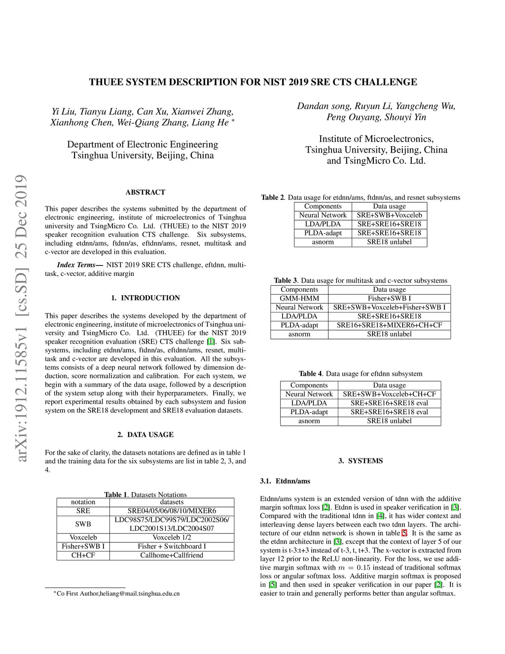 This paper describes the systems submitted by the department of electronic engineering, institute of microelectronics of Tsinghua university and TsingMicro Co. Ltd. (THUEE) to the NIST 2019 speaker recognition evaluation CTS challenge. Six subsystems, including etdnn/ams, ftdnn/as, eftdnn/ams, resnet, multitask and c-vector are developed in this evaluation.