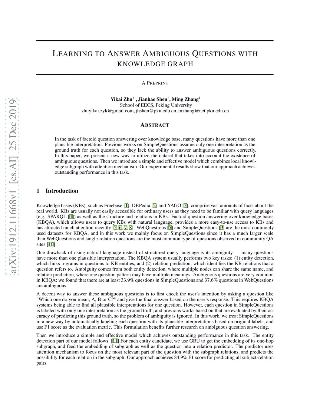 Learning to Answer Ambiguous Questions with Knowledge Graph