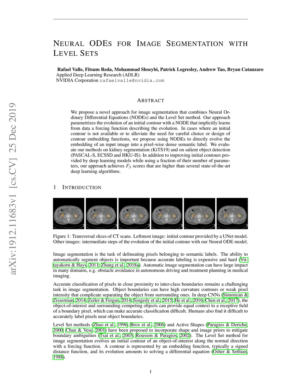 We propose a novel approach for image segmentation that combines Neural Ordinary Differential Equations (NODEs) and the Level Set method. Our approach parametrizes the evolution of an initial contour with a NODE that implicitly learns from data a speed function describing the evolution. In addition, for cases where an initial contour is not available and to alleviate the need for careful choice or design of contour embedding functions, we propose a NODE-based method that evolves an image embedding into a dense per-pixel semantic label space. We evaluate our methods on kidney segmentation (KiTS19) and on salient object detection (PASCAL-S, ECSSD and HKU-IS). In addition to improving initial contours provided by deep learning models while using a fraction of their number of parameters, our approach achieves F scores that are higher than several state-of-the-art deep learning algorithms.