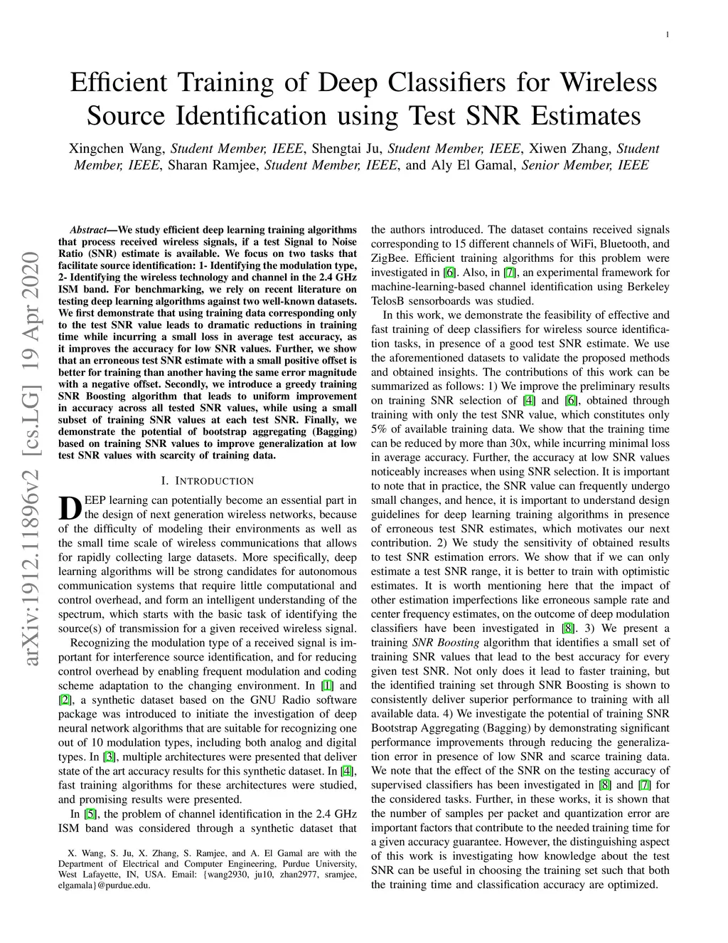 We study efficient deep learning training algorithms that process received wireless signals, if a test Signal to Noise Ratio (SNR) estimate is available. We focus on two tasks that facilitate source identification: 1- Identifying the modulation type, 2- Identifying the wireless technology and channel in the 2.4 GHz ISM band. For benchmarking, we rely on recent literature on testing deep learning algorithms against two well-known datasets. We first demonstrate that using training data corresponding only to the test SNR value leads to dramatic reductions in training time while incurring a small loss in average test accuracy, as it improves the accuracy for low SNR values. Further, we show that an erroneous test SNR estimate with a small positive offset is better for training than another having the same error magnitude with a negative offset. Secondly, we introduce a greedy training SNR Boosting algorithm that leads to uniform improvement in accuracy across all tested SNR values, while using a small subset of training SNR values at each test SNR. Finally, we demonstrate the potential of bootstrap aggregating (Bagging) based on training SNR values to improve generalization at low test SNR values with scarcity of training data.