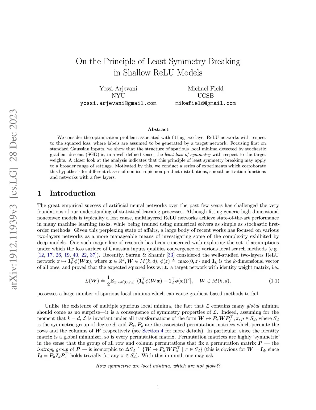 We consider the optimization problem associated with fitting two-layer ReLU networks with respect to the squared loss, where labels are assumed to be generated by a target network. Focusing first on standard Gaussian inputs, we show that the structure of spurious local minima detected by stochastic gradient descent (SGD) is, in a well-defined sense, the \emph{least loss of symmetry} with respect to the target weights. A closer look at the analysis indicates that this principle of least symmetry breaking may apply to a broader range of settings. Motivated by this, we conduct a series of experiments which corroborate this hypothesis for different classes of non-isotropic non-product distributions, smooth activation functions and networks with a few layers.