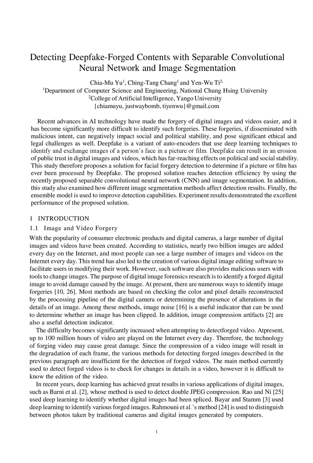 Recent advances in AI technology have made the forgery of digital images and videos easier, and it has become significantly more difficult to identify such forgeries. These forgeries, if disseminated with malicious intent, can negatively impact social and political stability, and pose significant ethical and legal challenges as well. Deepfake is a variant of auto-encoders that use deep learning techniques to identify and exchange images of a person's face in a picture or film. Deepfake can result in an erosion of public trust in digital images and videos, which has far-reaching effects on political and social stability. This study therefore proposes a solution for facial forgery detection to determine if a picture or film has ever been processed by Deepfake. The proposed solution reaches detection efficiency by using the recently proposed separable convolutional neural network (CNN) and image segmentation. In addition, this study also examined how different image segmentation methods affect detection results. Finally, the ensemble model is used to improve detection capabilities. Experiment results demonstrated the excellent performance of the proposed solution.