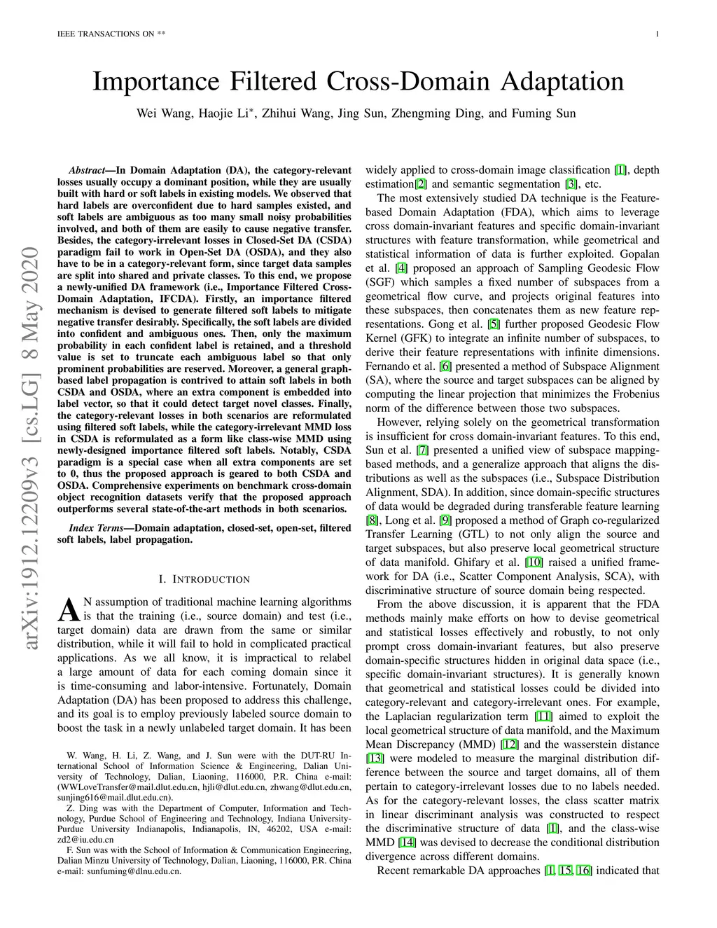 In Domain Adaptation (DA), the category-relevant losses usually occupy a dominant position, while they are usually built with hard or soft labels in existing models. We observed that hard labels are overconfident due to hard samples existed, and soft labels are ambiguous as too many small noisy probabilities involved, and both of them are easily to cause negative transfer. Besides, the category-irrelevant losses in Closed-Set DA (CSDA) paradigm fail to work in Open-Set DA (OSDA), and they also have to be in a category-relevant form, since target data samples are split into shared and private classes. To this end, we propose a newly-unified DA framework (i.e., Importance Filtered Cross-Domain Adaptation, IFCDA). Firstly, an importance filtered mechanism is devised to generate filtered soft labels to mitigate negative transfer desirably. Specifically, the soft labels are divided into confident and ambiguous ones. Then, only the maximum probability in each confident label is retained, and a threshold value is set to truncate each ambiguous label so that only prominent probabilities are reserved. Moreover, a general graph-based label propagation is contrived to attain soft labels in both CSDA and OSDA, where an extra component is embedded into label vector, so that it could detect target novel classes. Finally, the category-relevant losses in both scenarios are reformulated using filtered soft labels, while the category-irrelevant MMD loss in CSDA is reformulated as a form like class-wise MMD using newly-designed importance filtered soft labels. Notably, CSDA paradigm is a special case when all extra components are set to 0, thus the proposed approach is geared to both CSDA and OSDA. Comprehensive experiments on benchmark cross-domain object recognition datasets verify that the proposed approach outperforms several state-of-the-art methods in both scenarios.