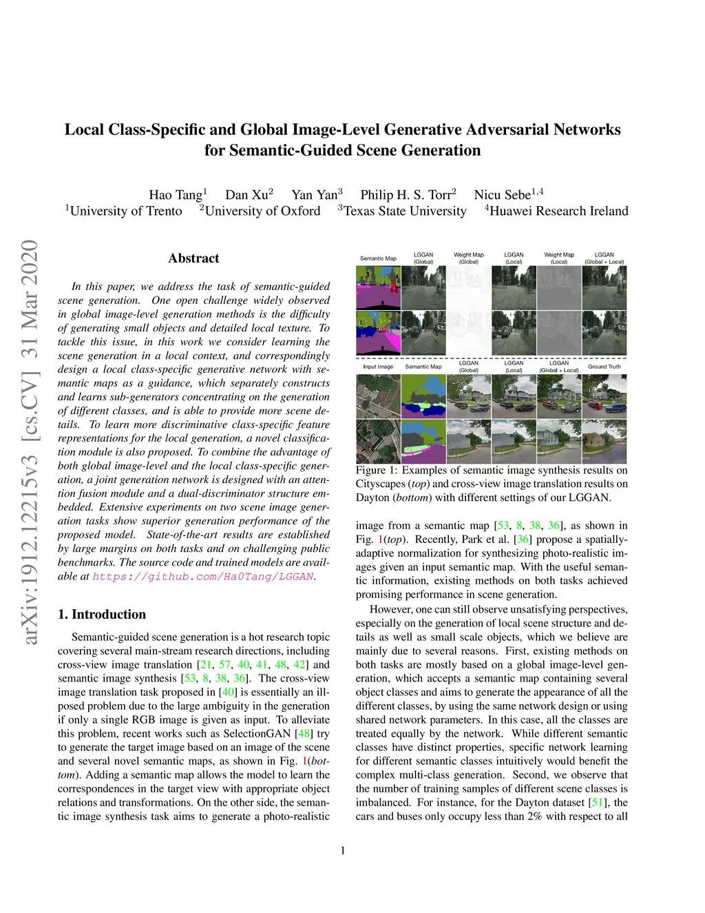 In this paper, we address the task of semantic-guided scene generation. One open challenge in scene generation is the difficulty of the generation of small objects and detailed local texture, which has been widely observed in global image-level generation methods. To tackle this issue, in this work we consider learning the scene generation in a local context, and correspondingly design a local class-specific generative network with semantic maps as a guidance, which separately constructs and learns sub-generators concentrating on the generation of different classes, and is able to provide more scene details. To learn more discriminative class-specific feature representations for the local generation, a novel classification module is also proposed. To combine the advantage of both the global image-level and the local class-specific generation, a joint generation network is designed with an attention fusion module and a dual-discriminator structure embedded. Extensive experiments on two scene image generation tasks show superior generation performance of the proposed model. The state-of-the-art results are established by large margins on both tasks and on challenging public benchmarks. The source code and trained models are available at https://github.com/Ha0Tang/LGGAN.