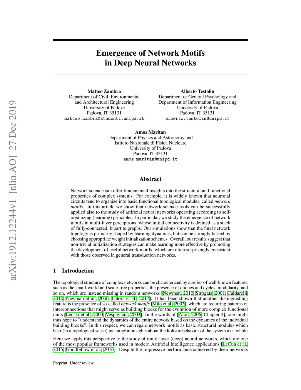 Network science can offer fundamental insights into the structural and functional properties of complex systems. For example, it is widely known that neuronal circuits tend to organize into basic functional topological modules, called "network motifs". In this article we show that network science tools can be successfully applied also to the study of artificial neural networks operating according to self-organizing (learning) principles. In particular, we study the emergence of network motifs in multi-layer perceptrons, whose initial connectivity is defined as a stack of fully-connected, bipartite graphs. Our simulations show that the final network topology is primarily shaped by learning dynamics, but can be strongly biased by choosing appropriate weight initialization schemes. Overall, our results suggest that non-trivial initialization strategies can make learning more effective by promoting the development of useful network motifs, which are often surprisingly consistent with those observed in general transduction networks.